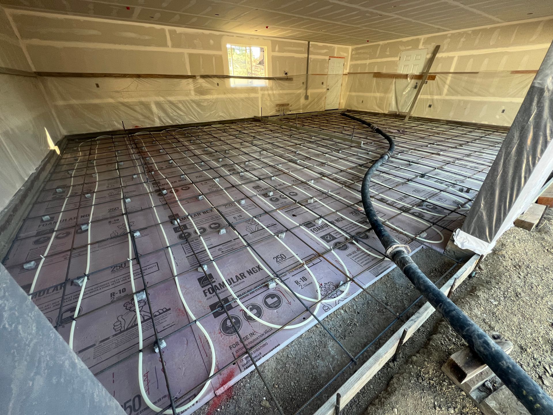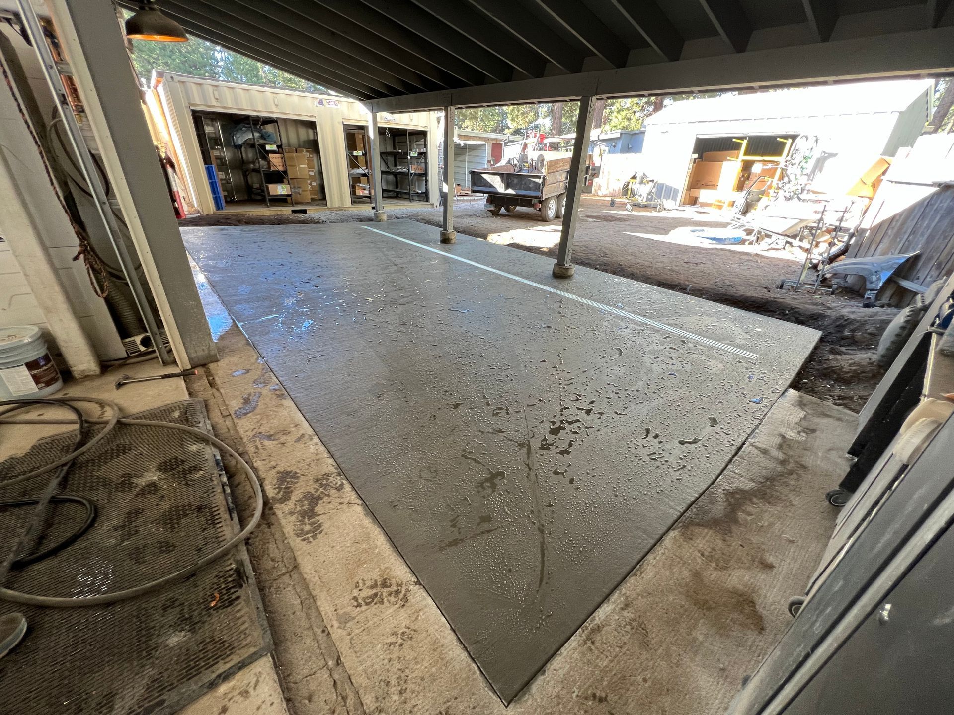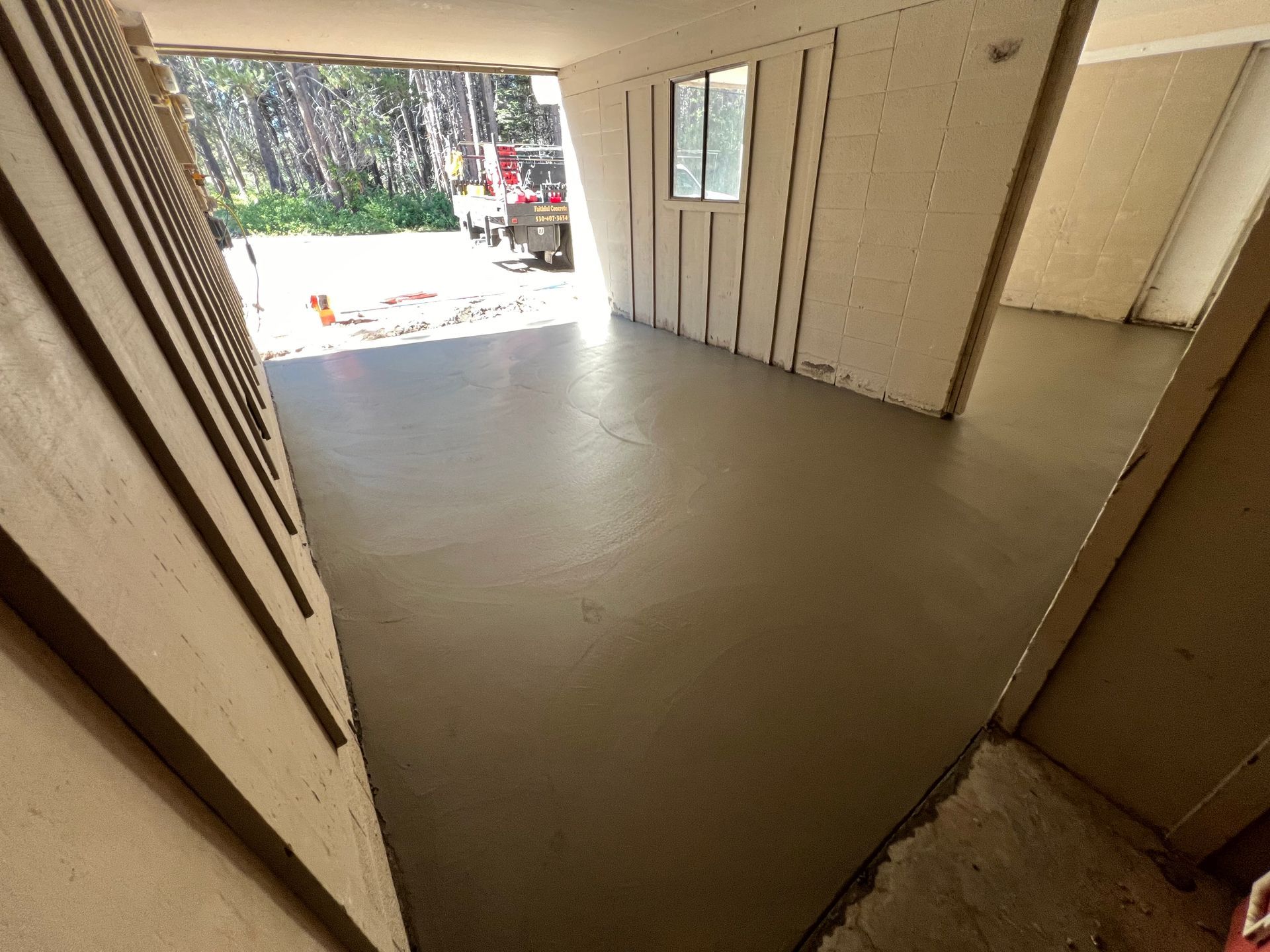A concrete floor is being installed in a garage.