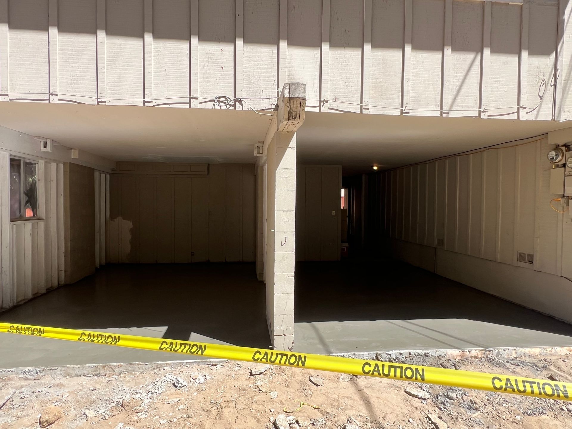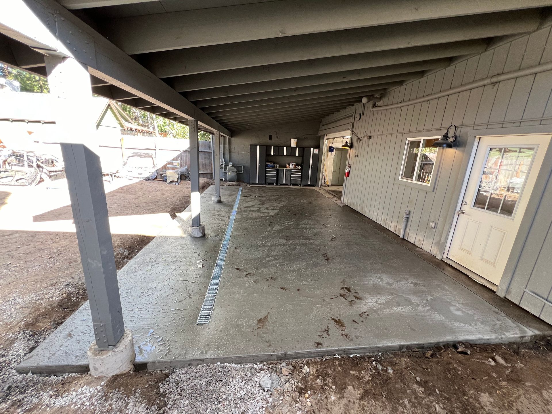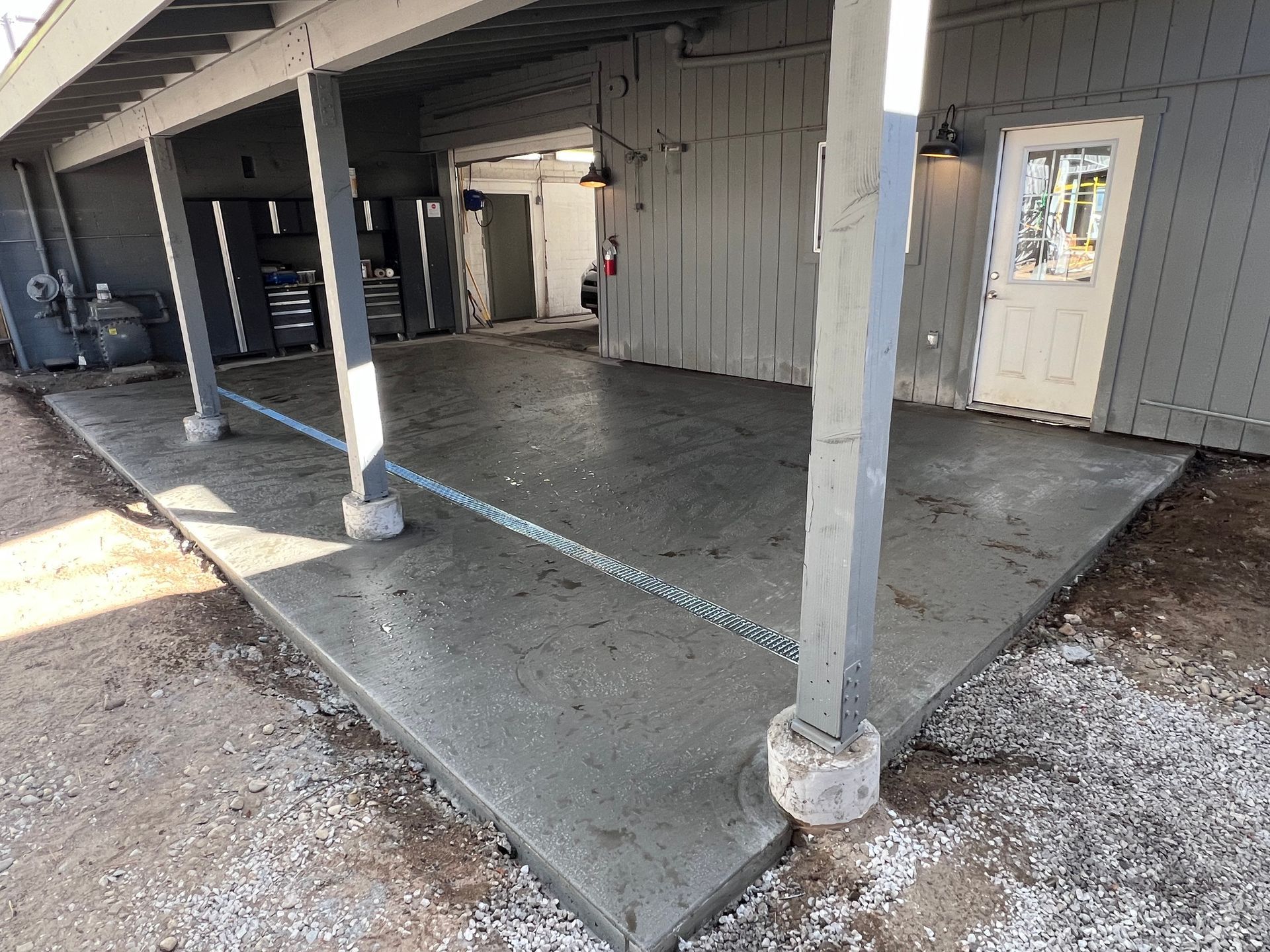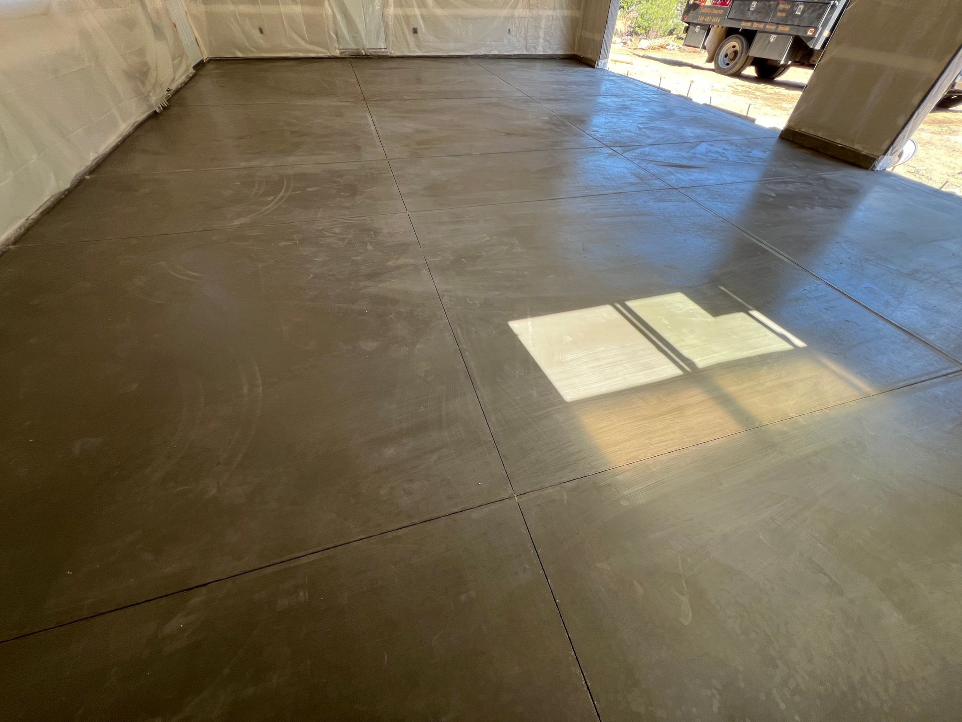 A concrete floor is being installed in a garage.