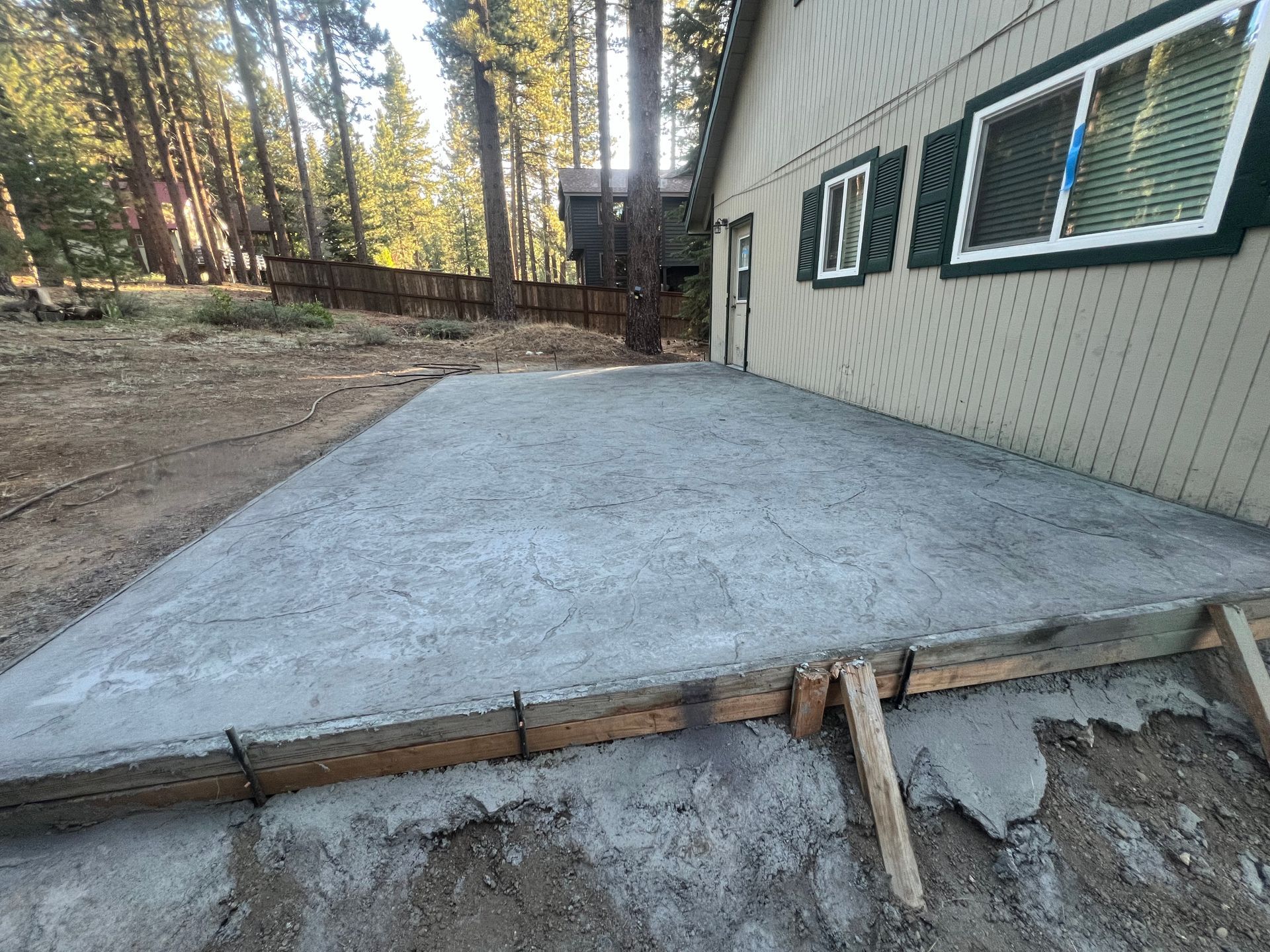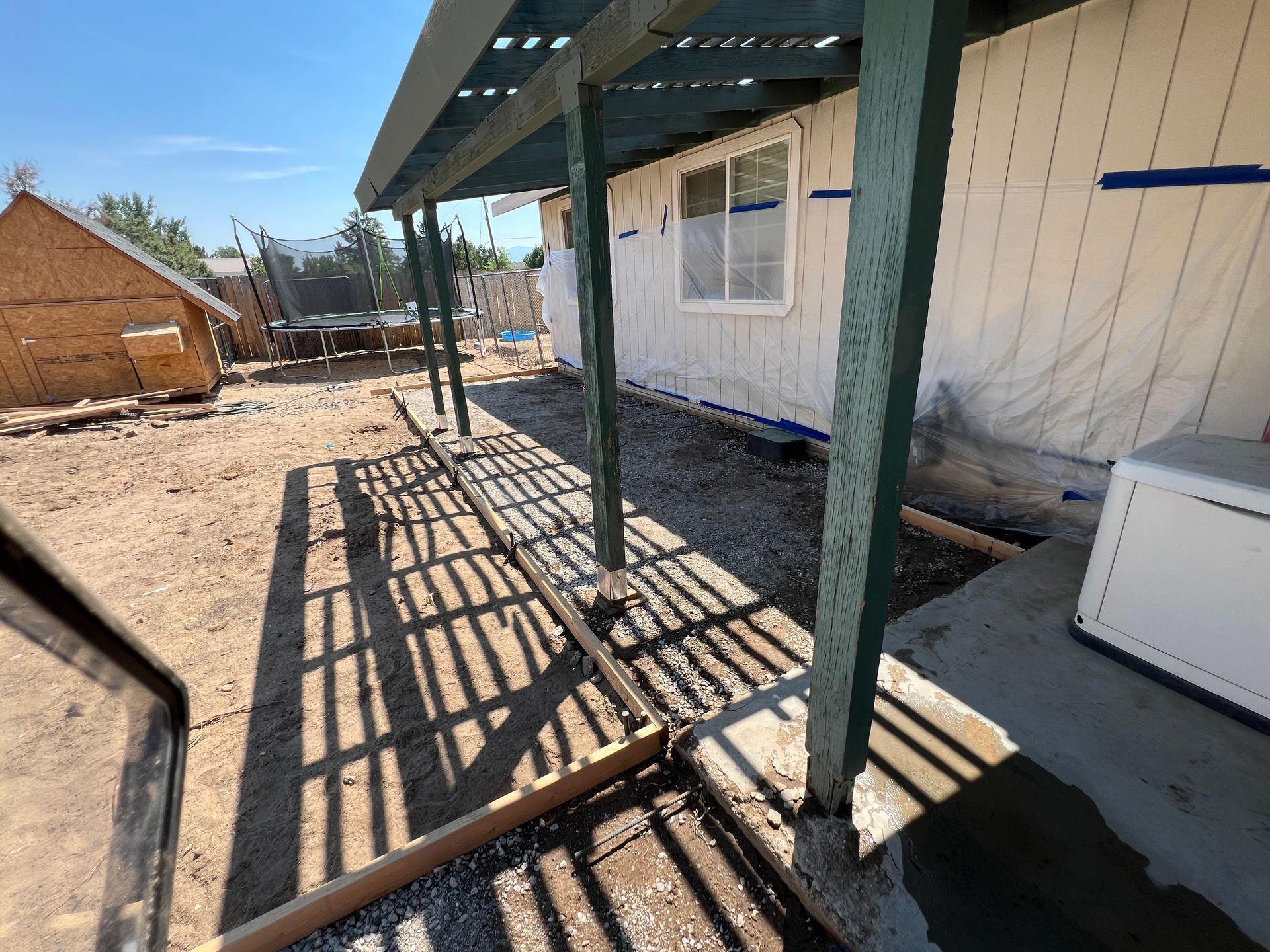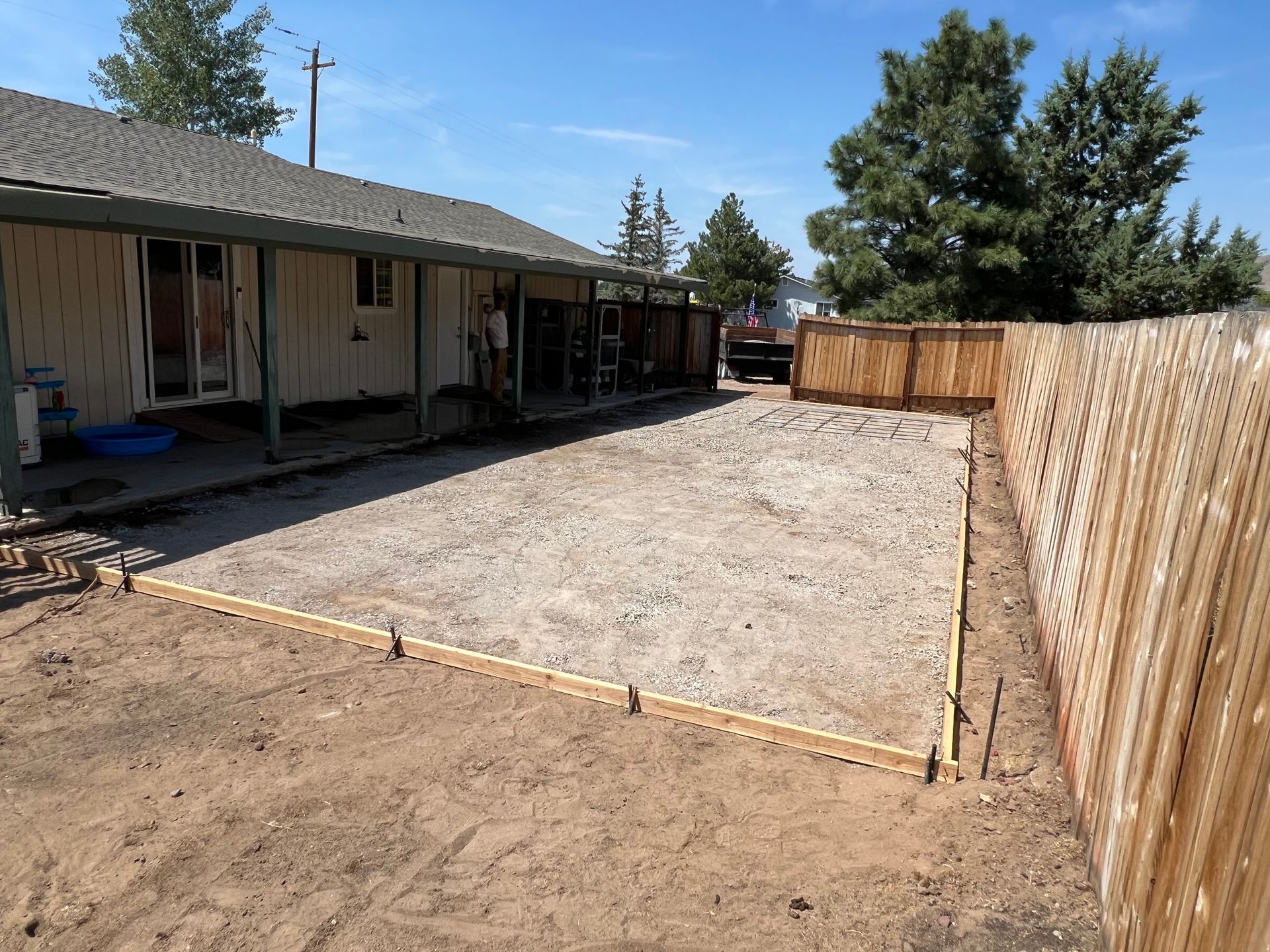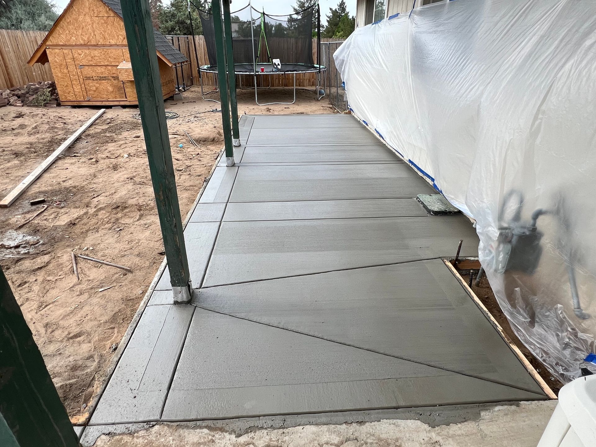 A concrete patio is being built in the backyard of a house.