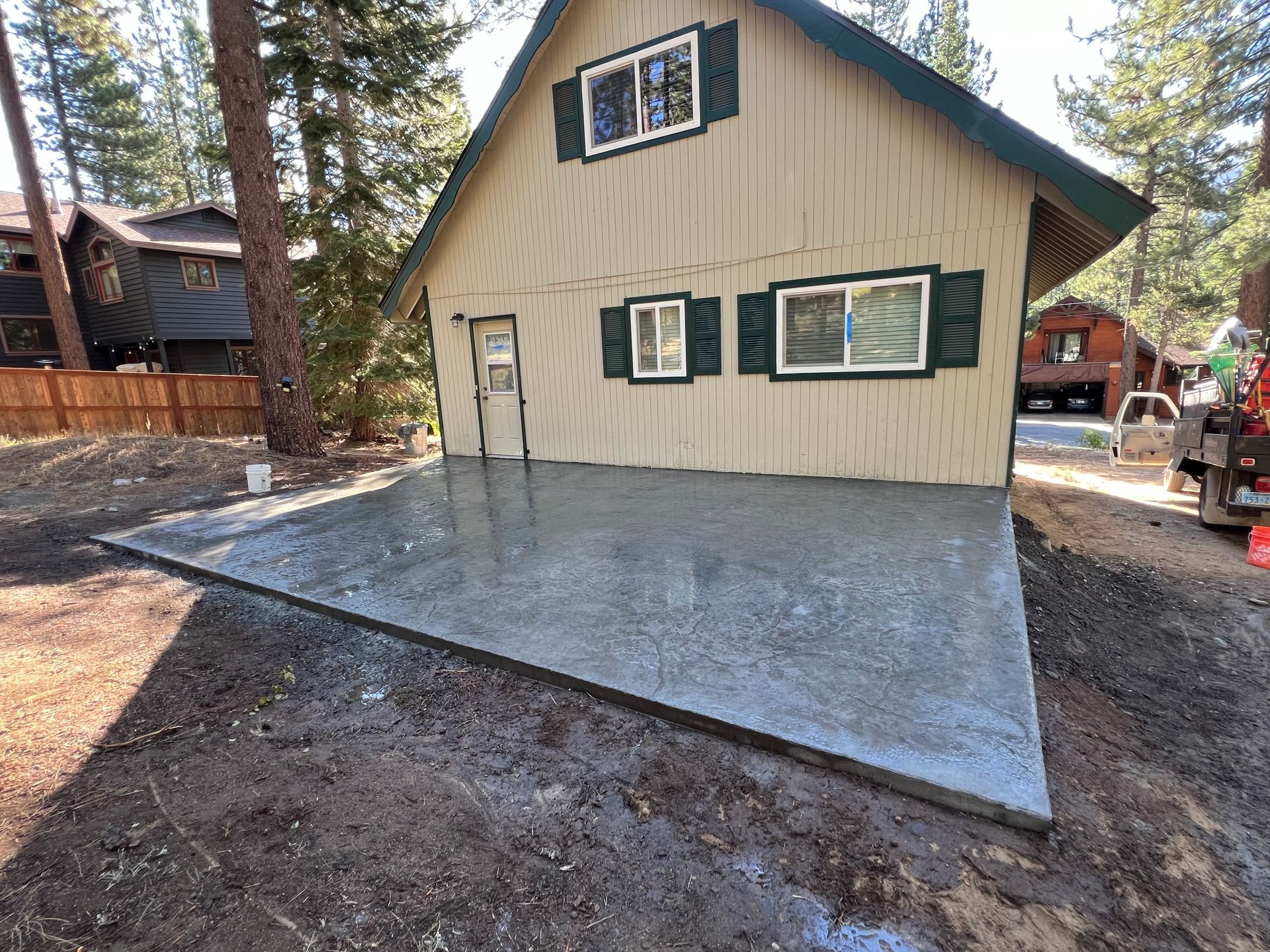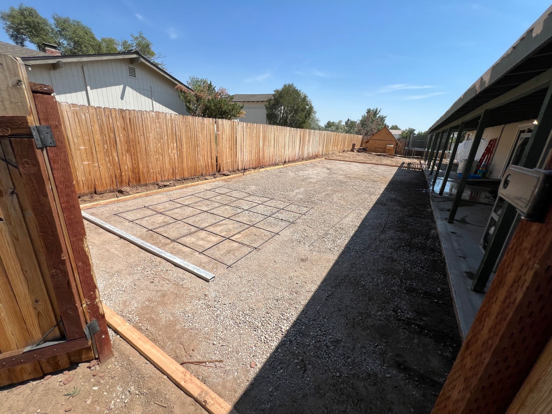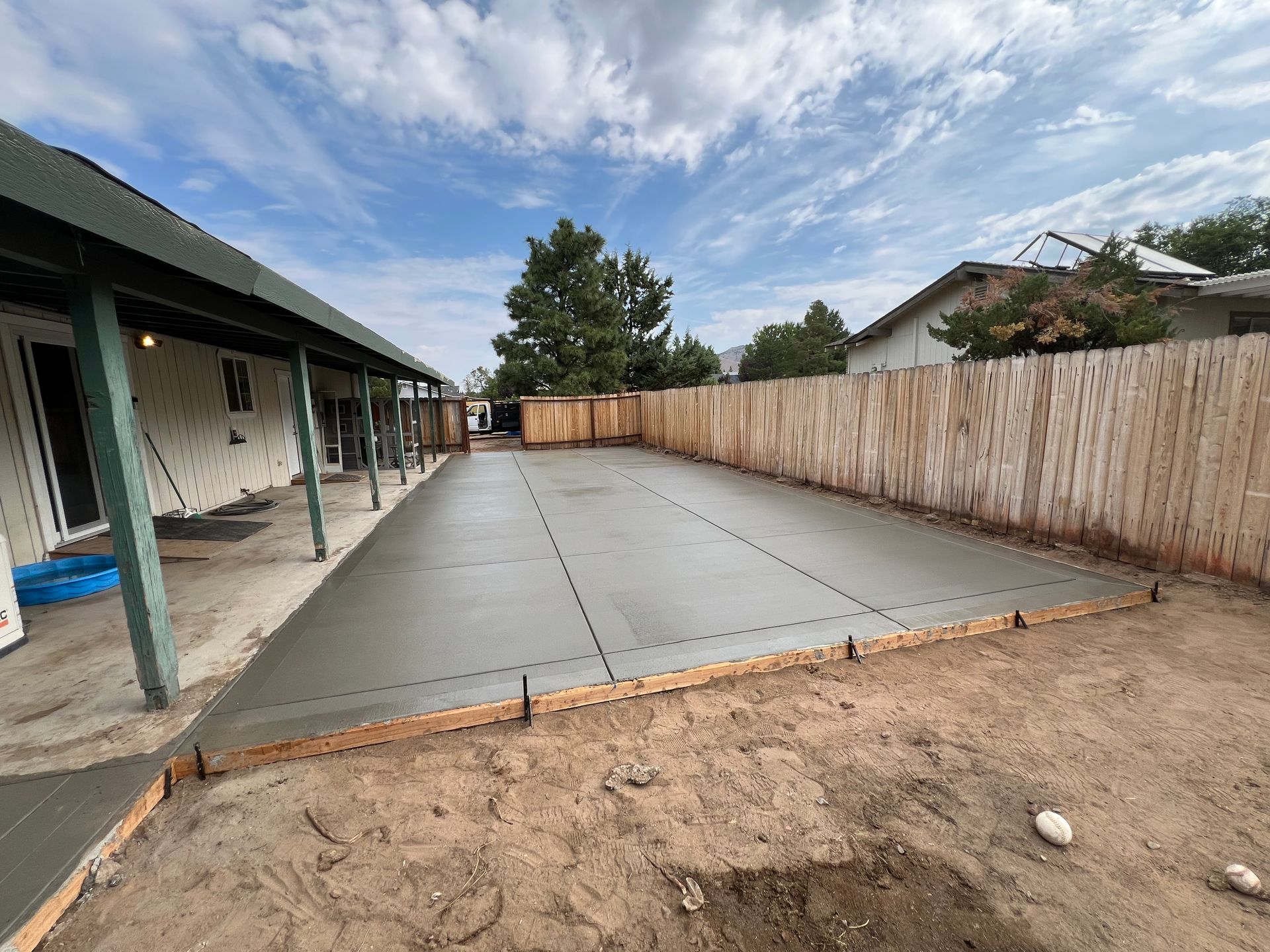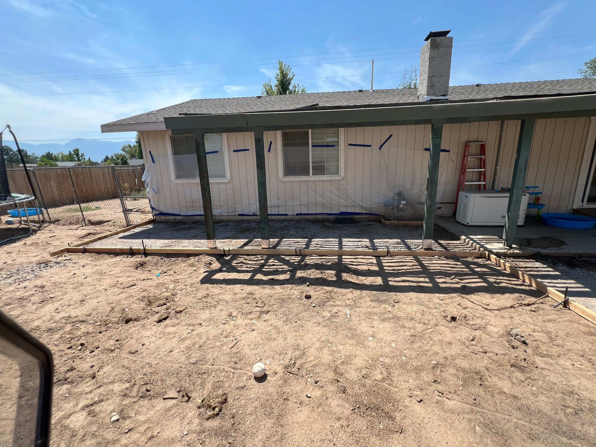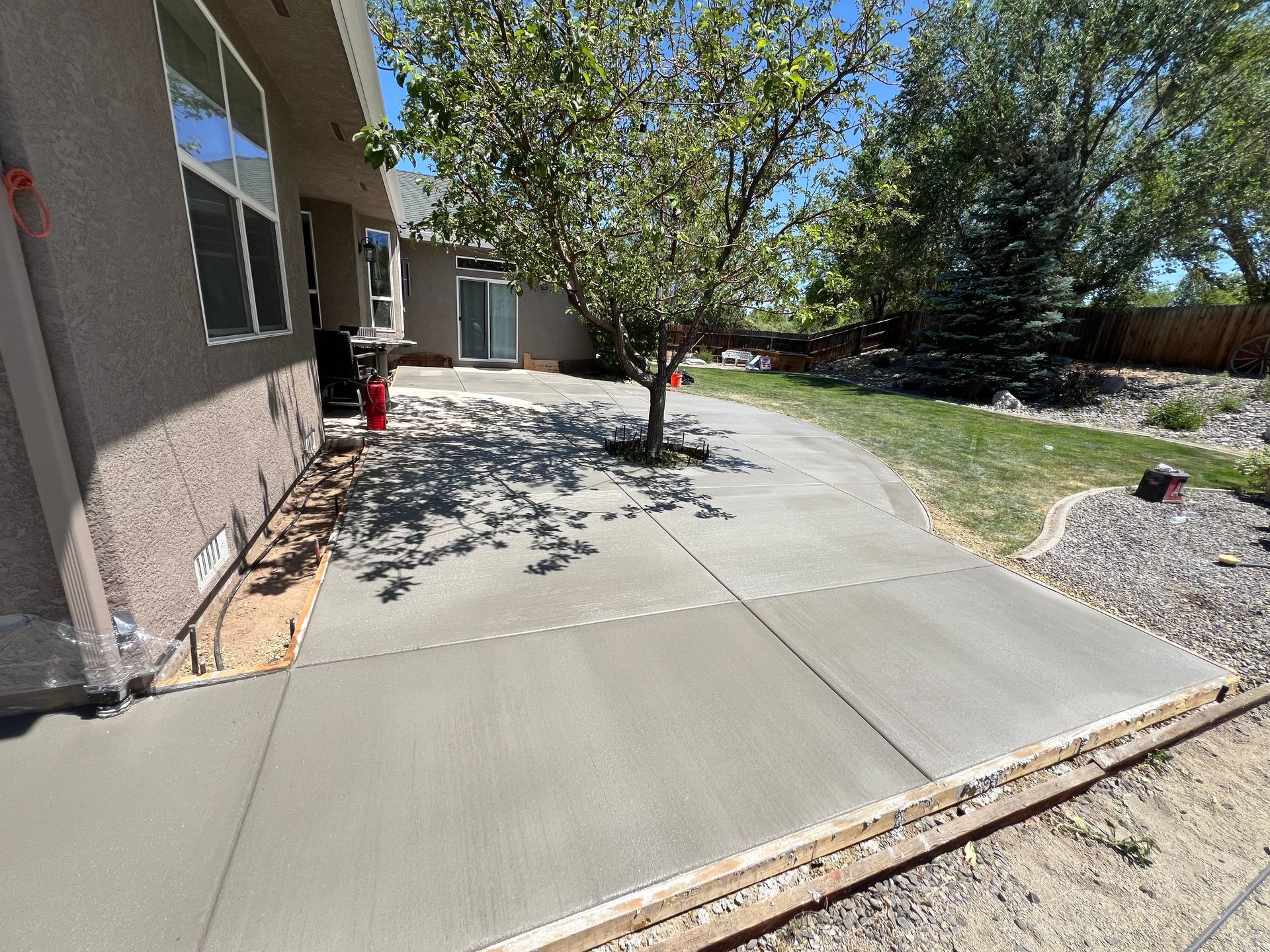 A concrete patio is being built in the backyard of a house.