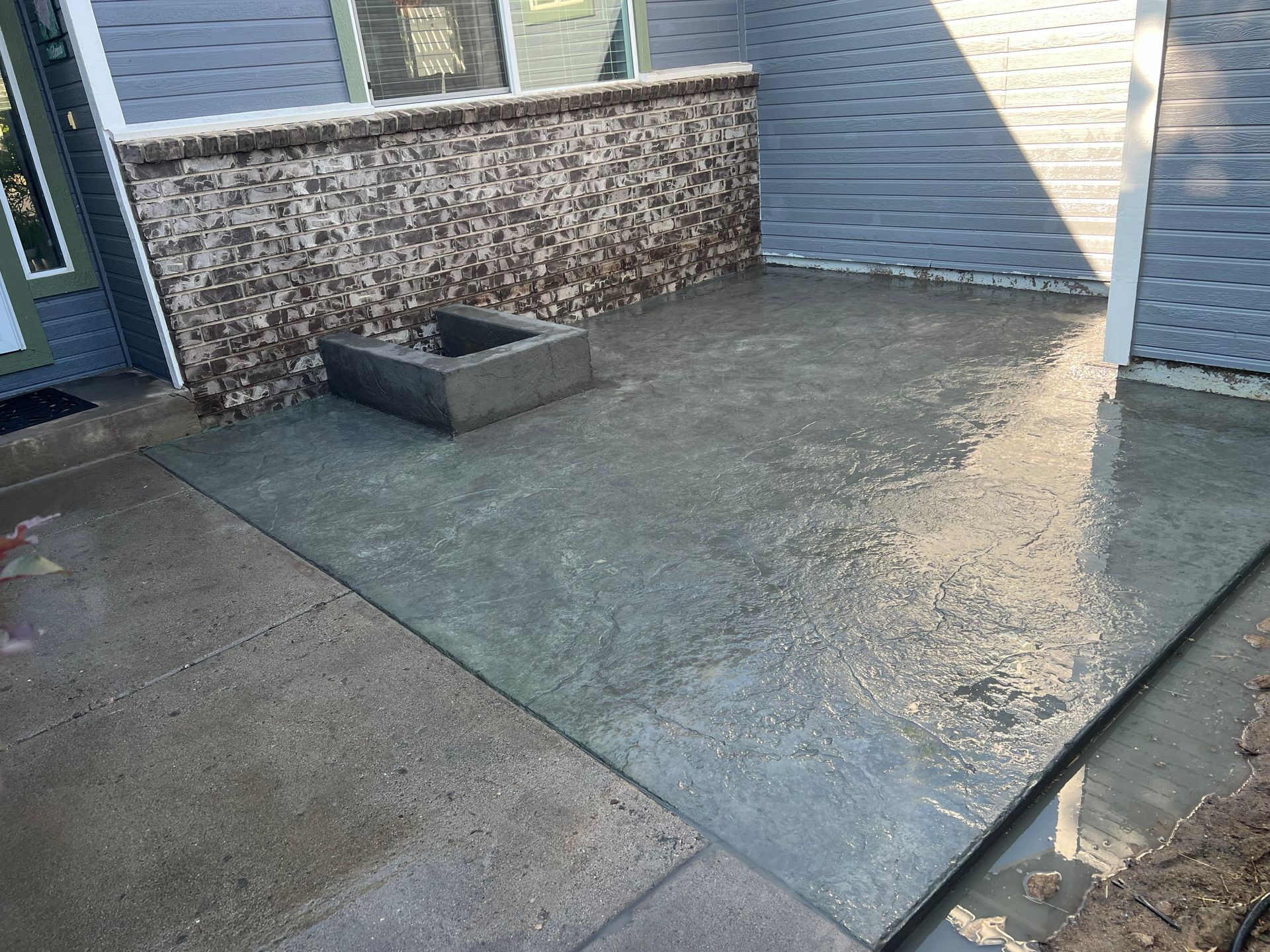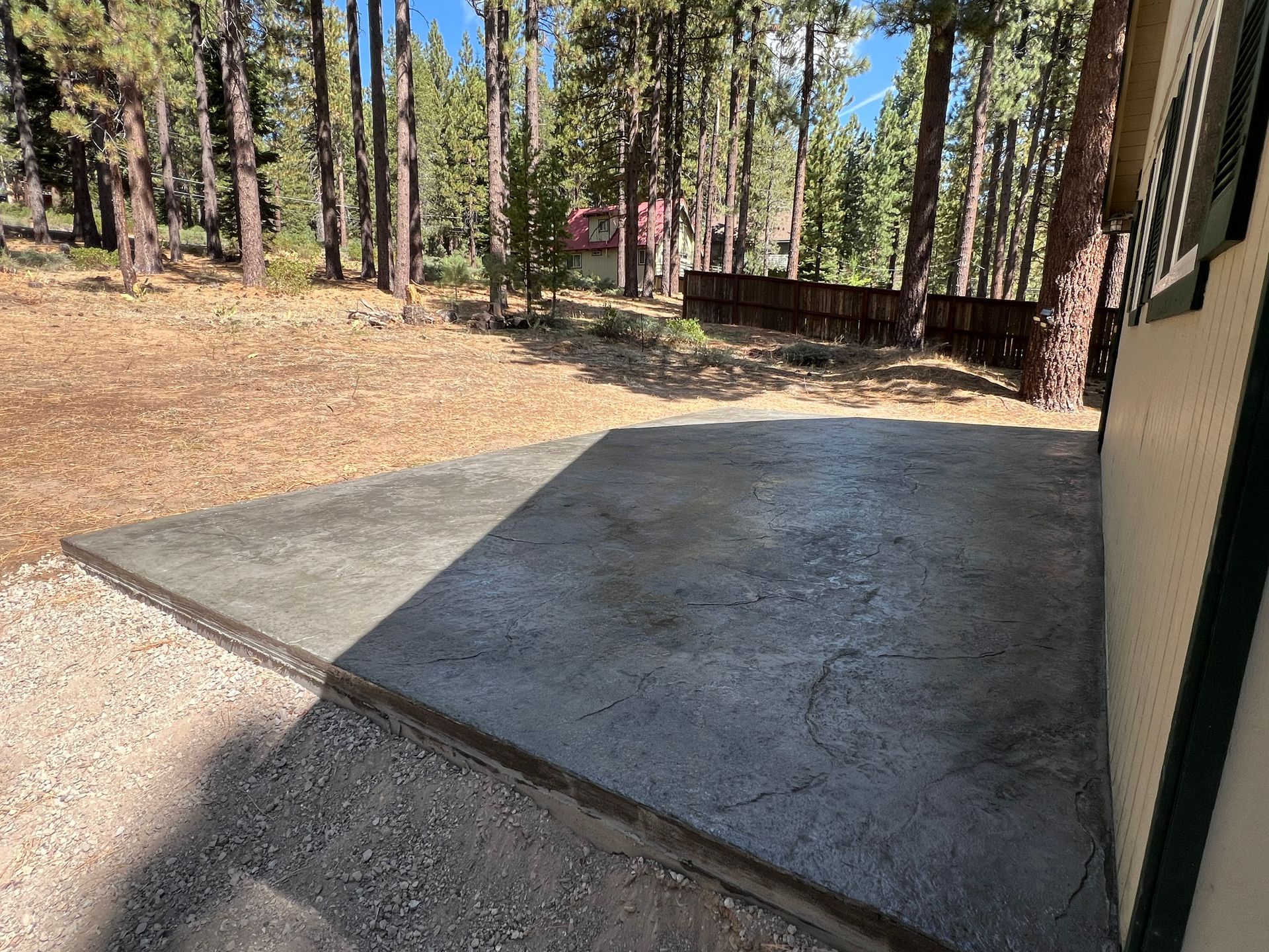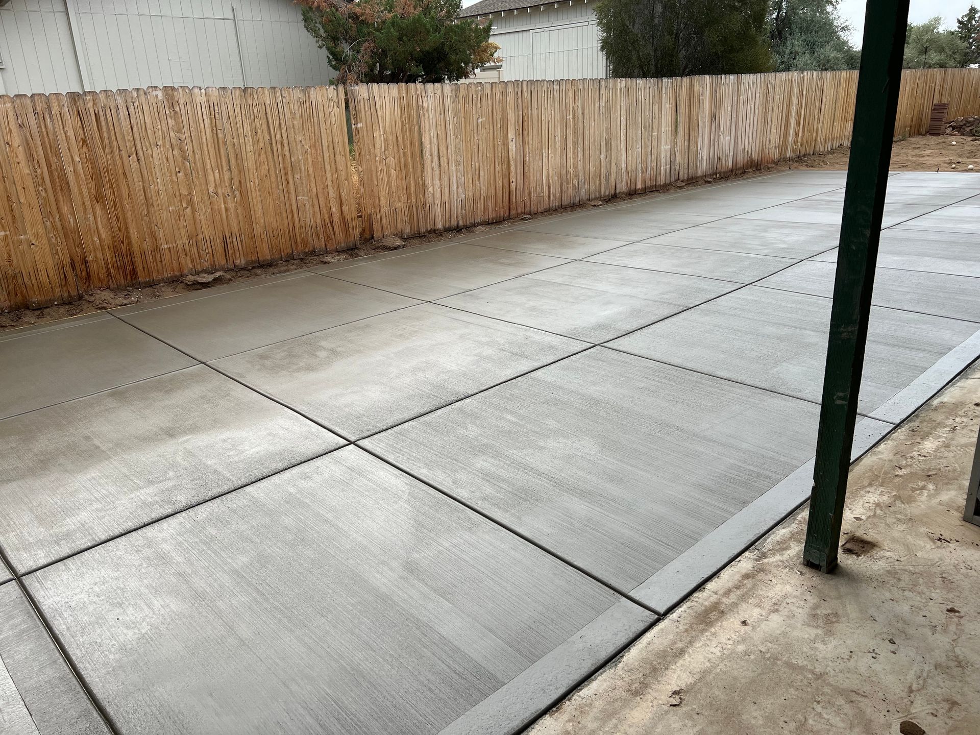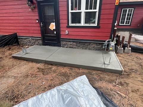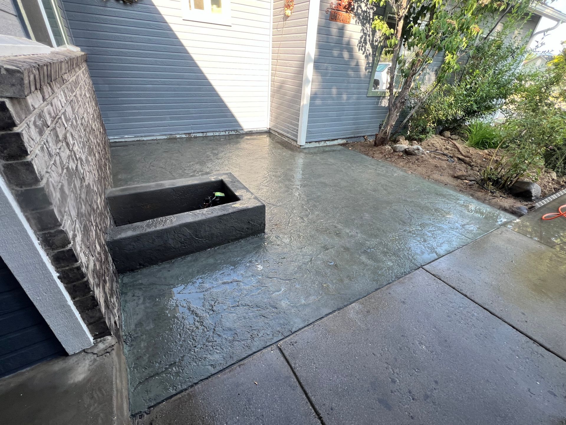 A concrete patio is being built in the backyard of a house.