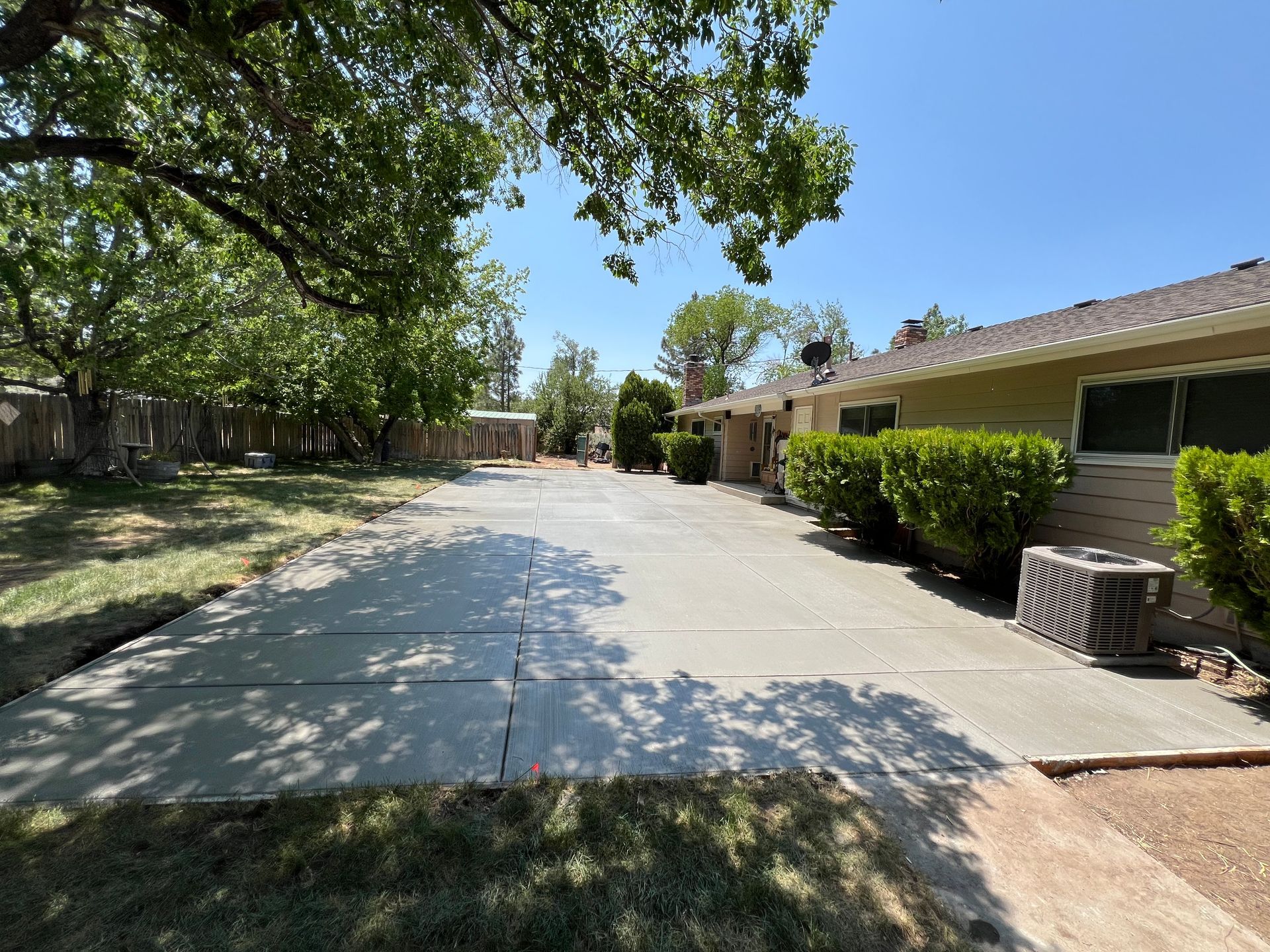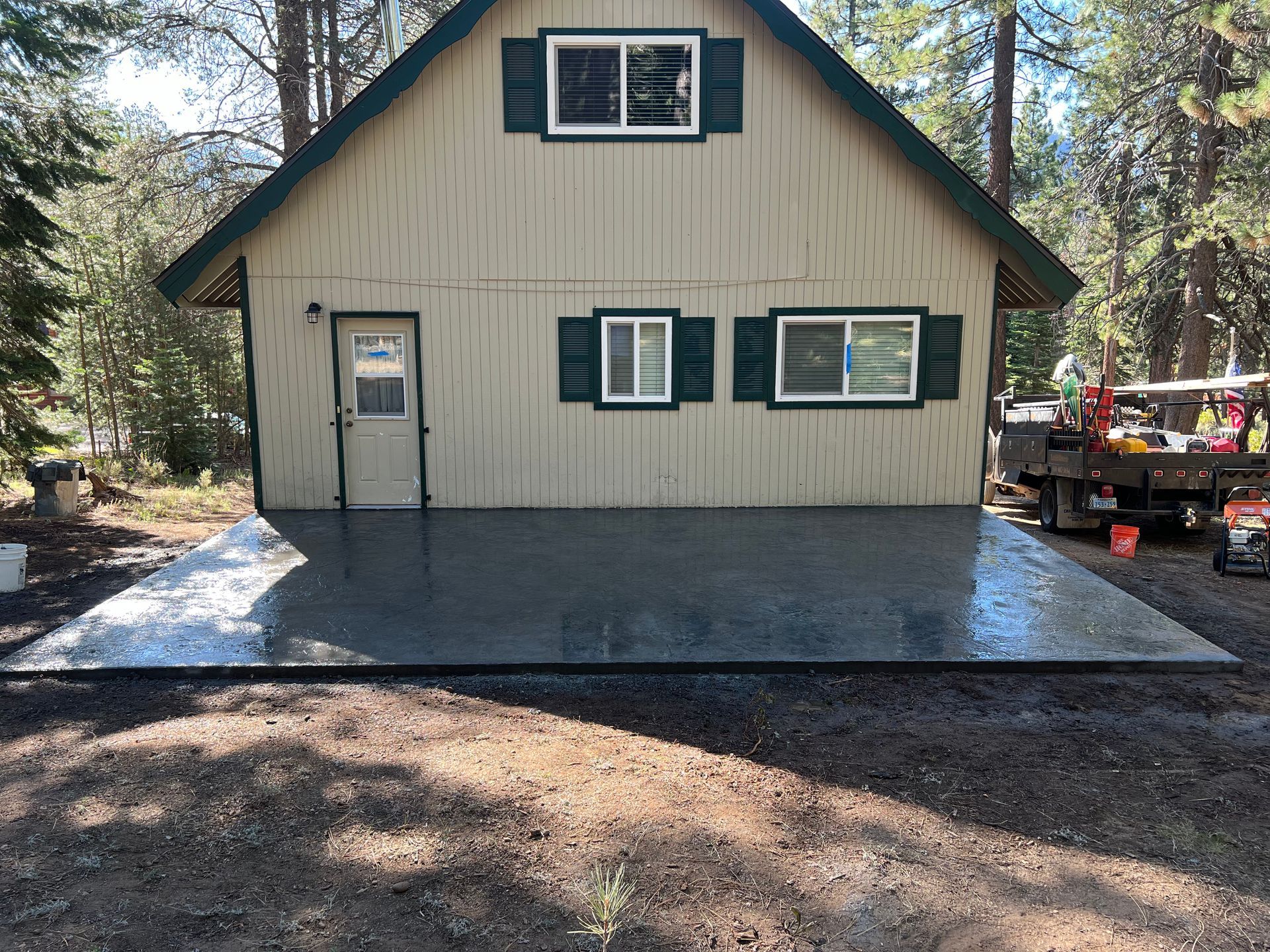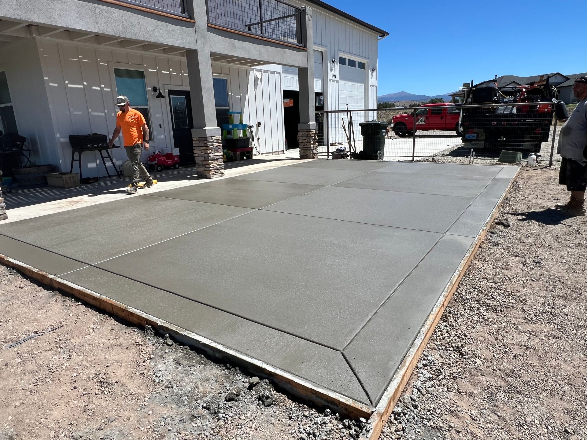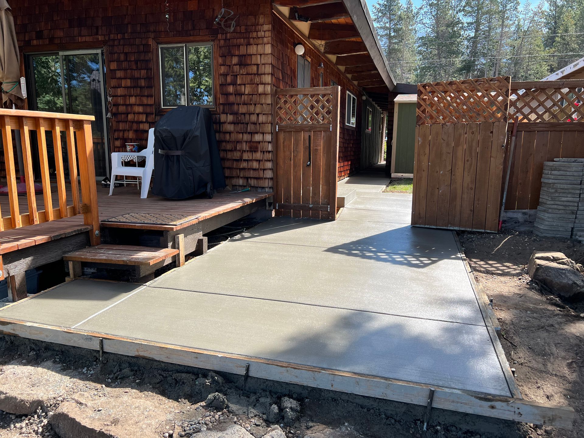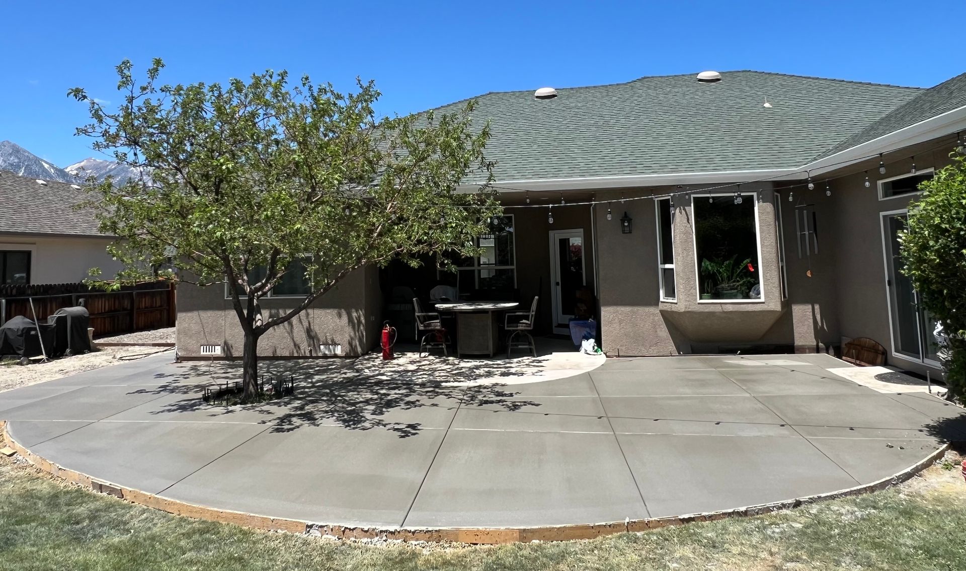 A concrete patio is being built in the backyard of a house.