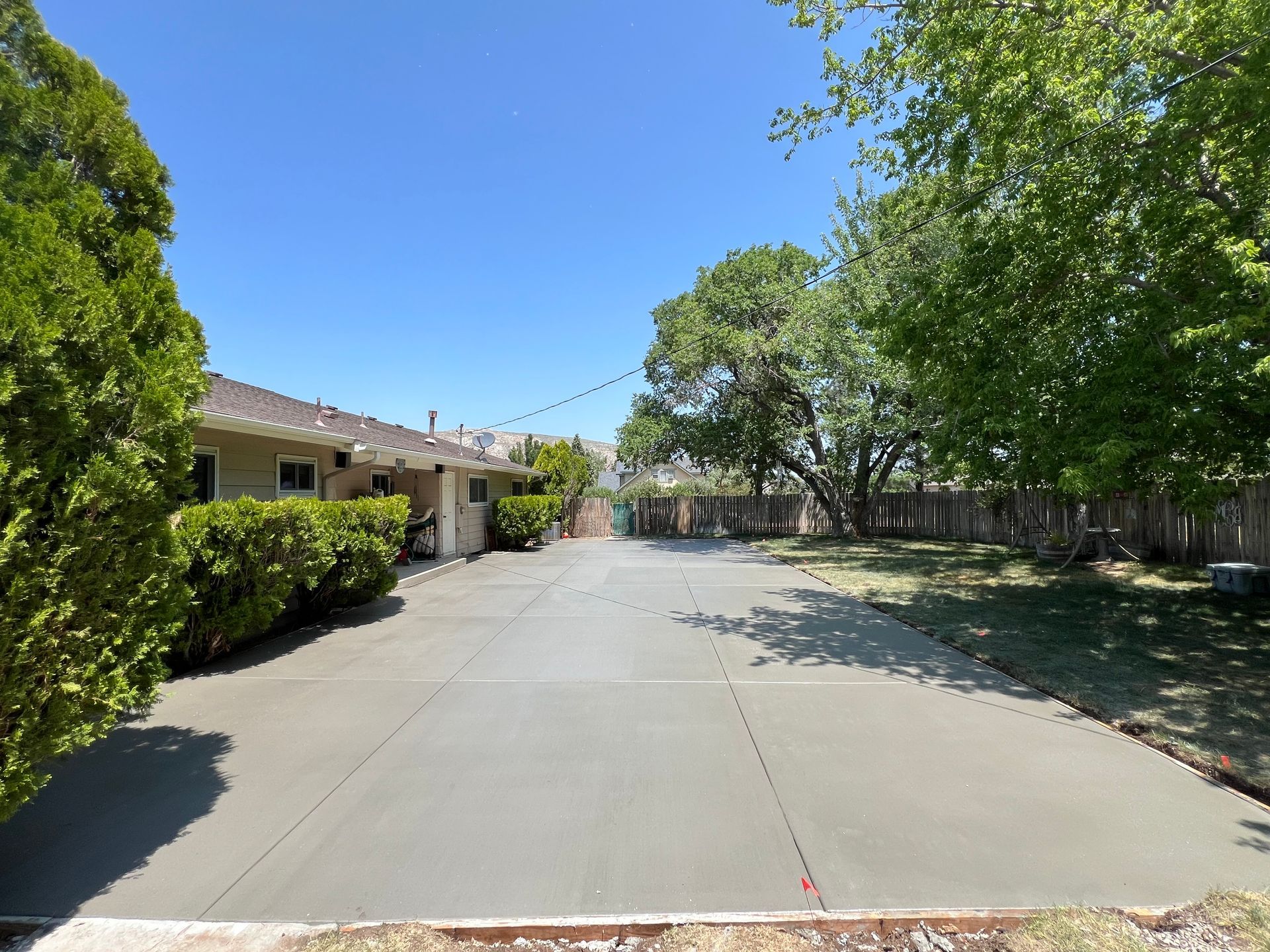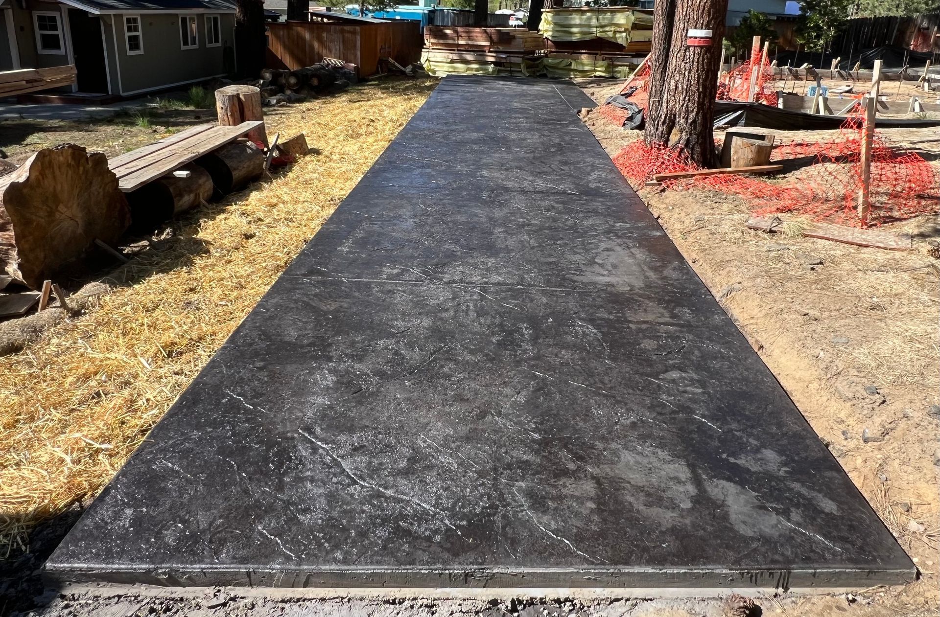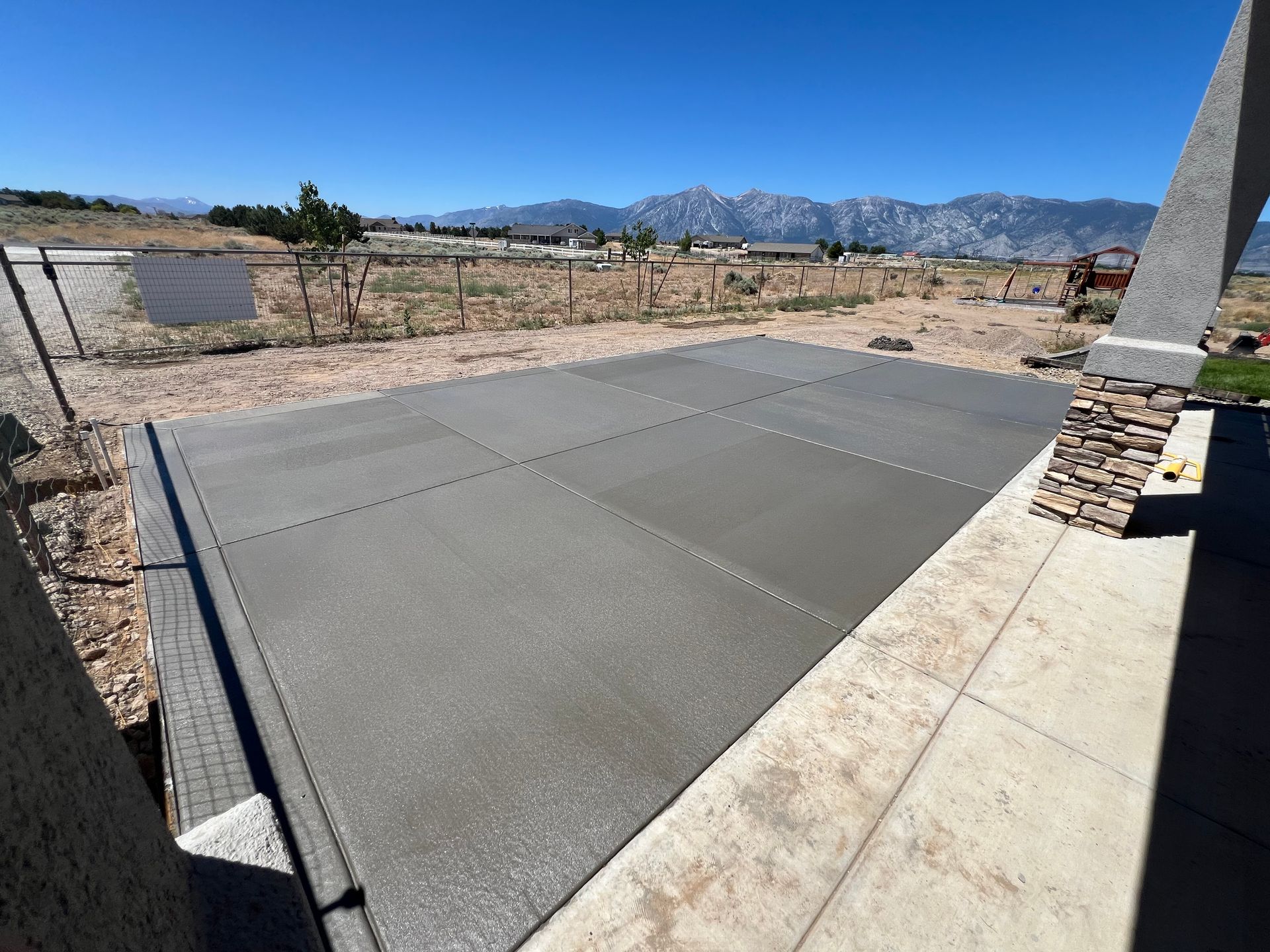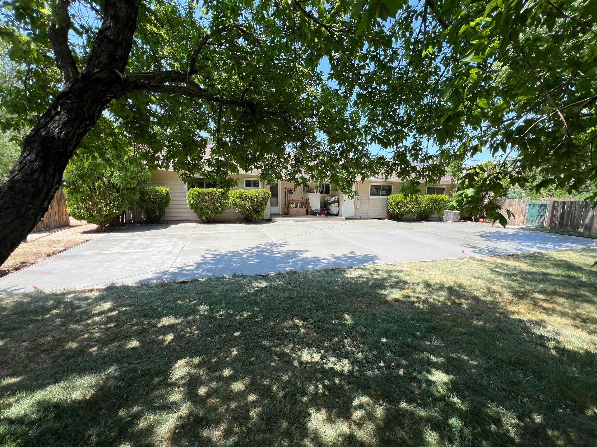 A concrete patio is being built in the backyard of a house.