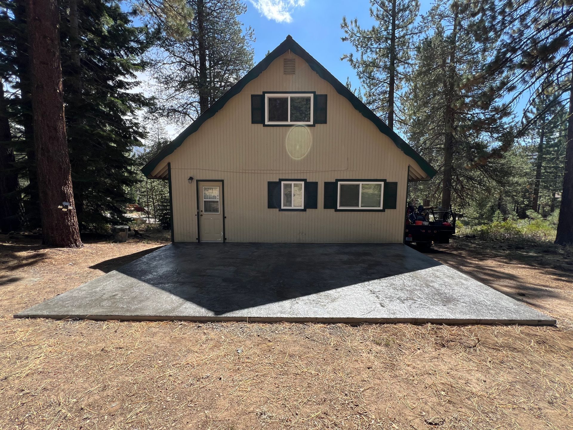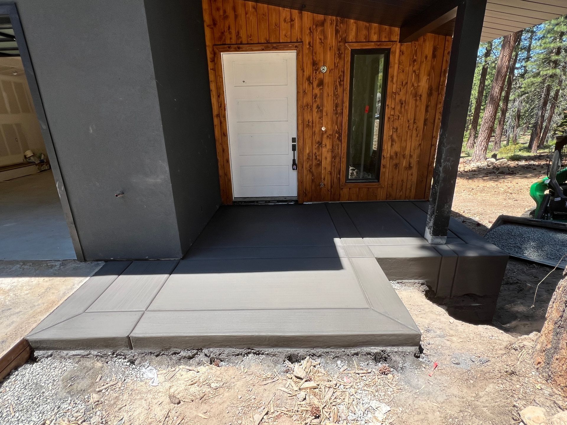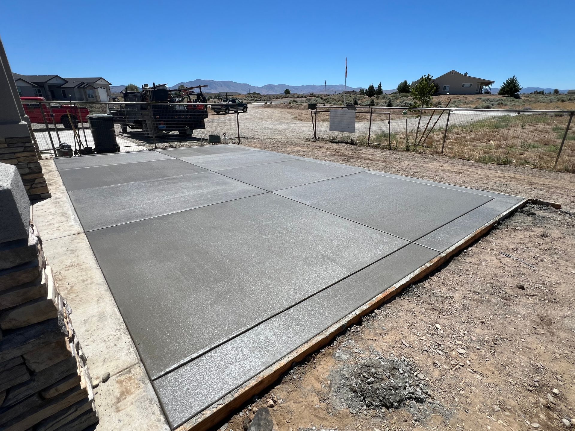 A large concrete slab is sitting in the dirt in front of a house.