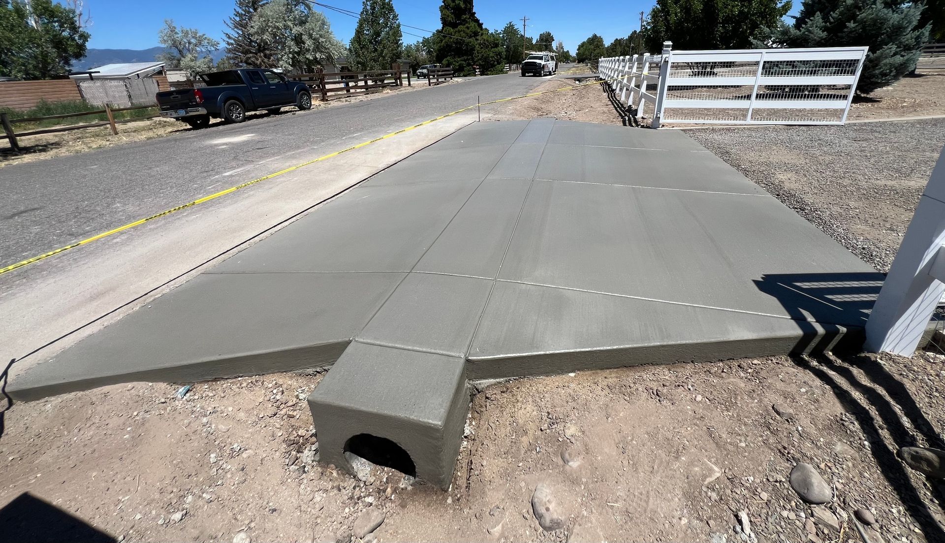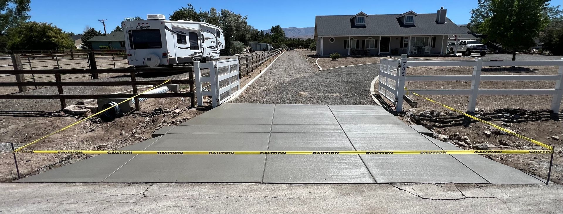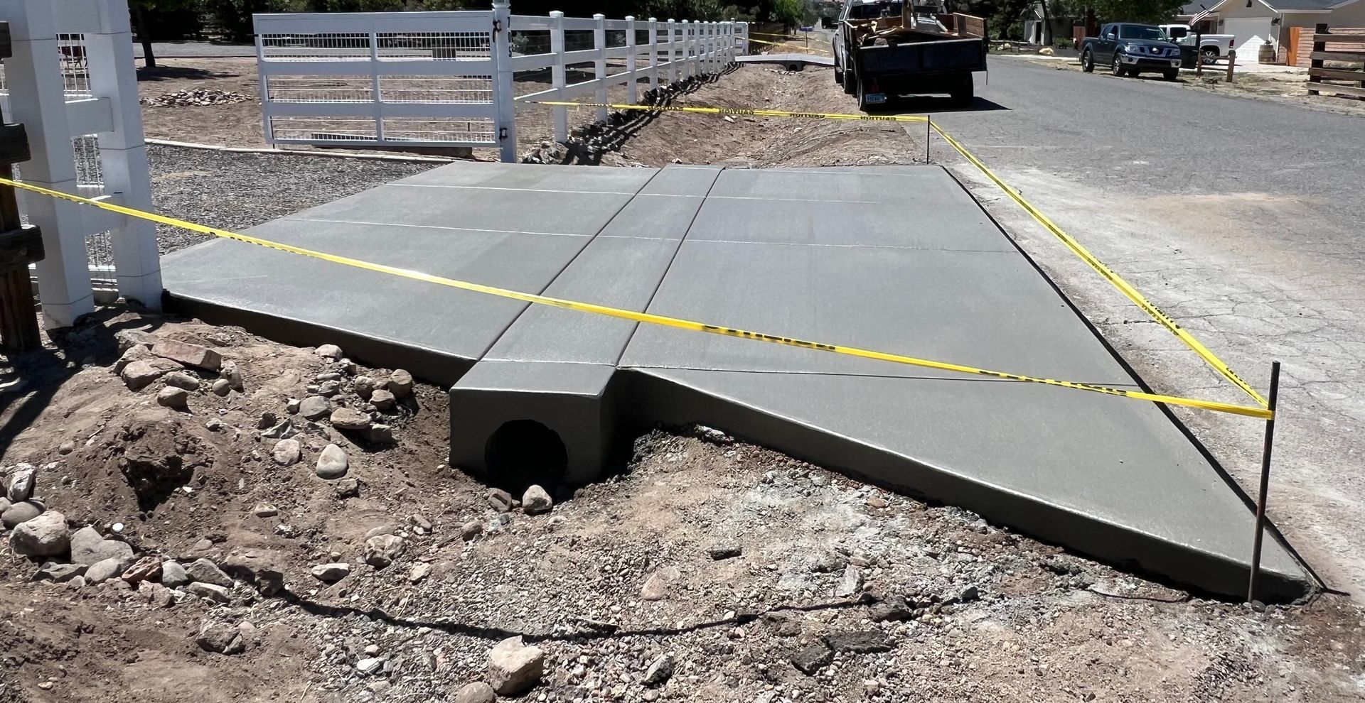 A large concrete slab is sitting in the dirt in front of a house.