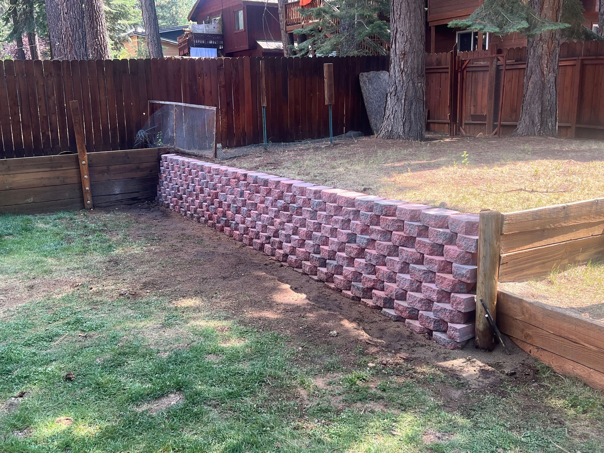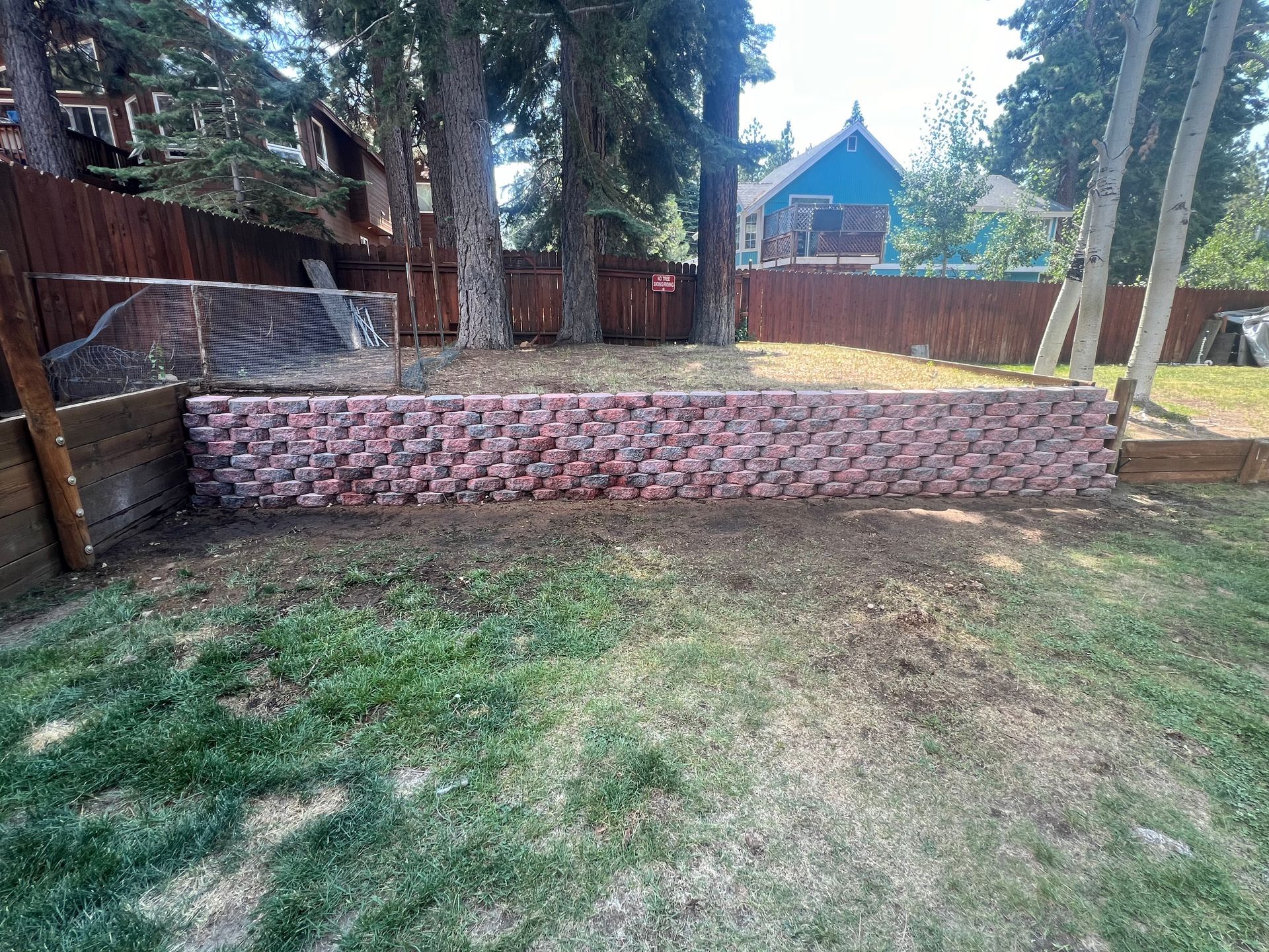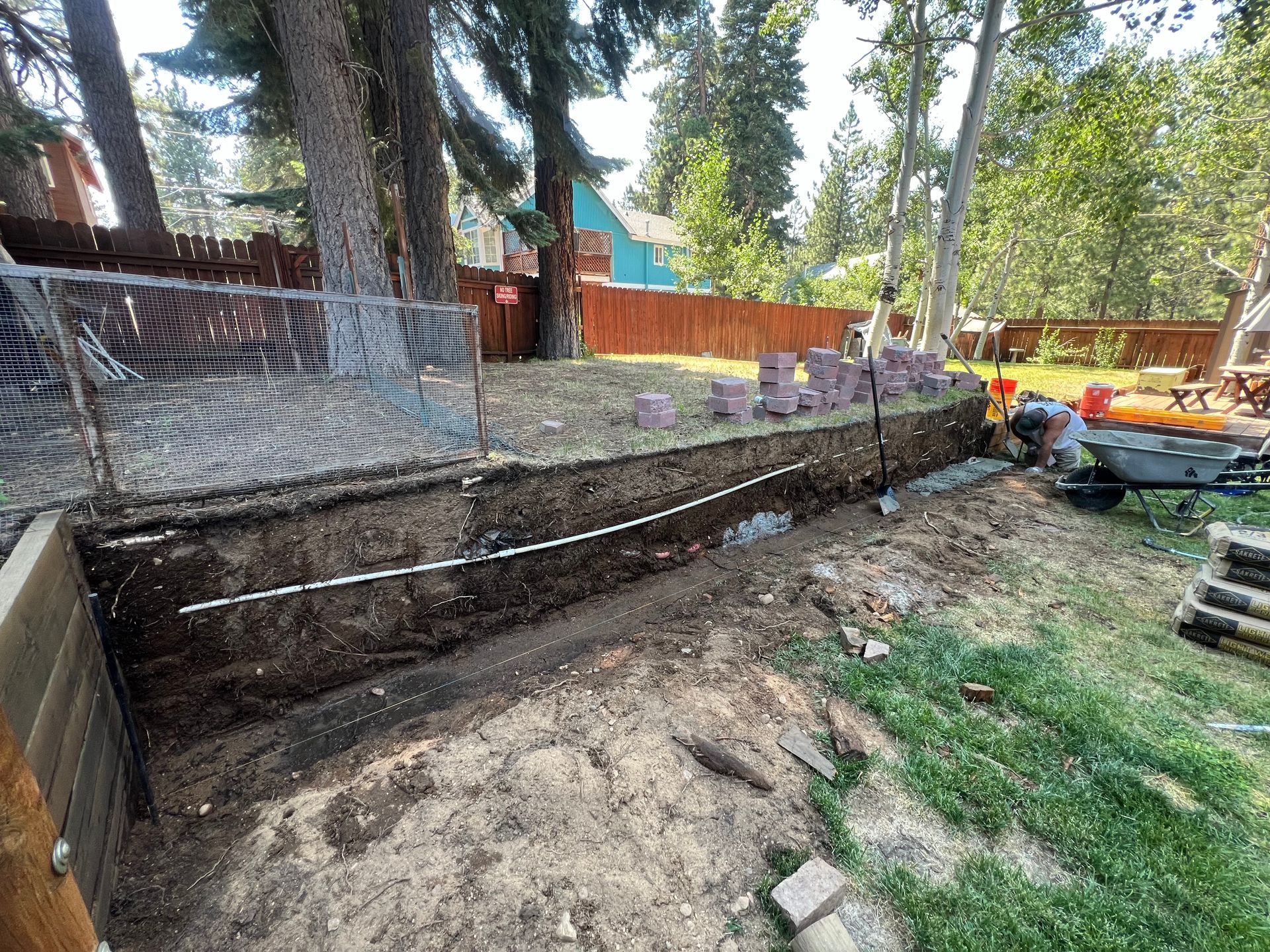 A patio is being built in the backyard of a house.
