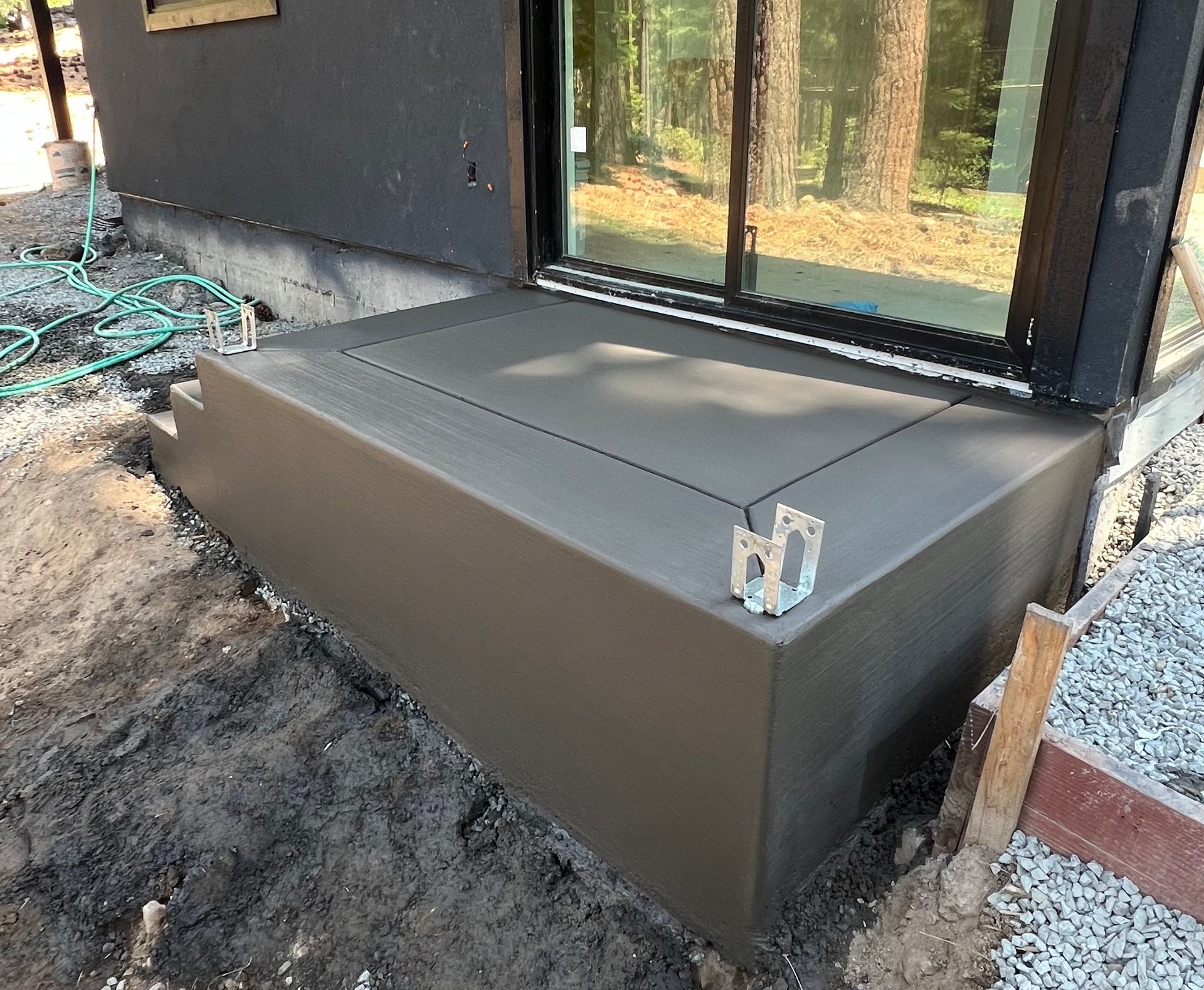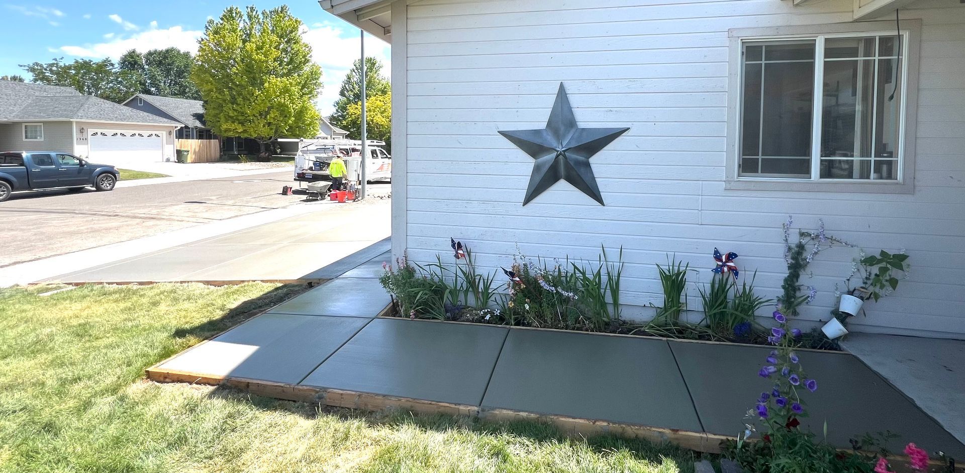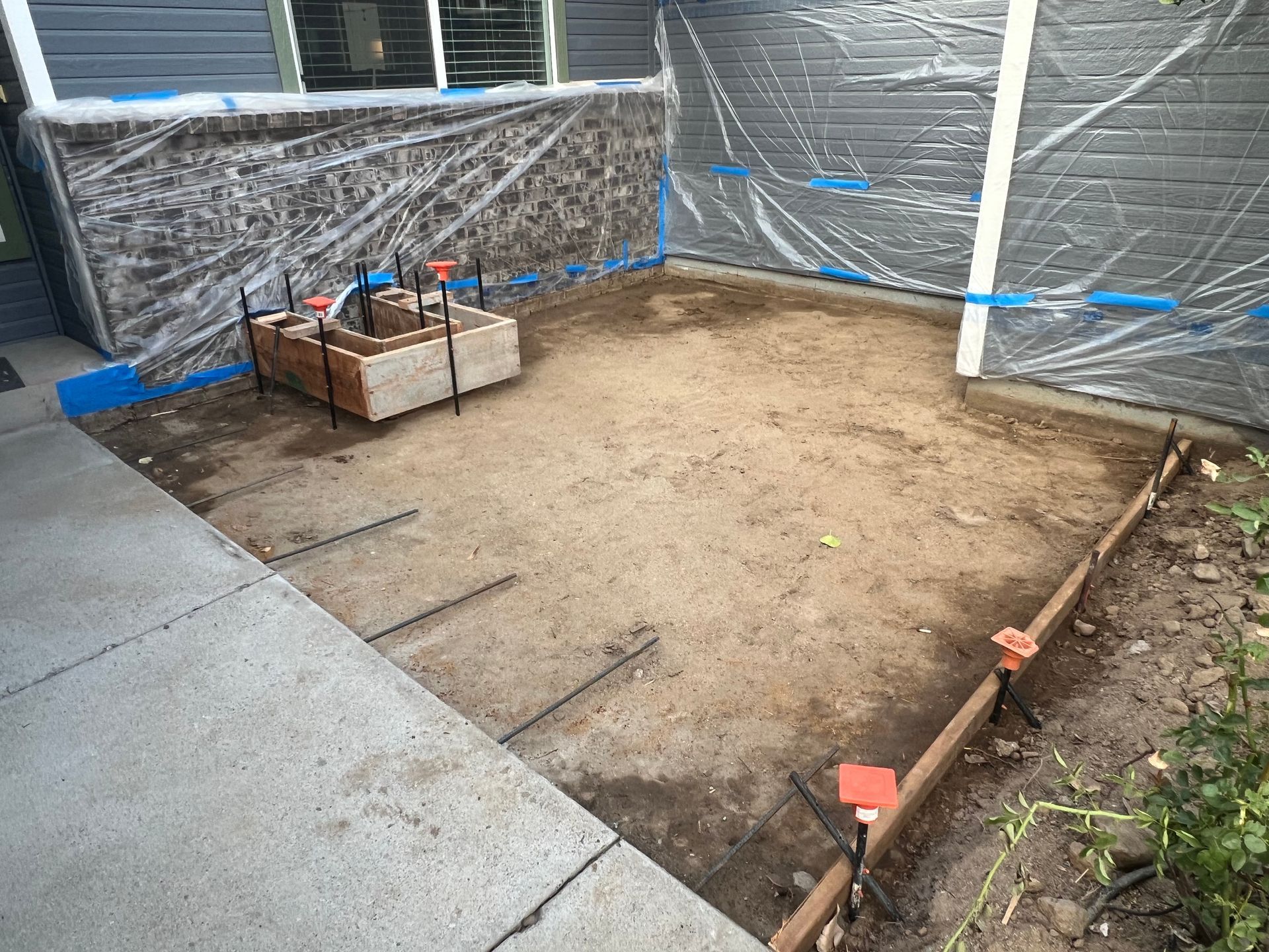 A concrete walkway is being built in front of a house