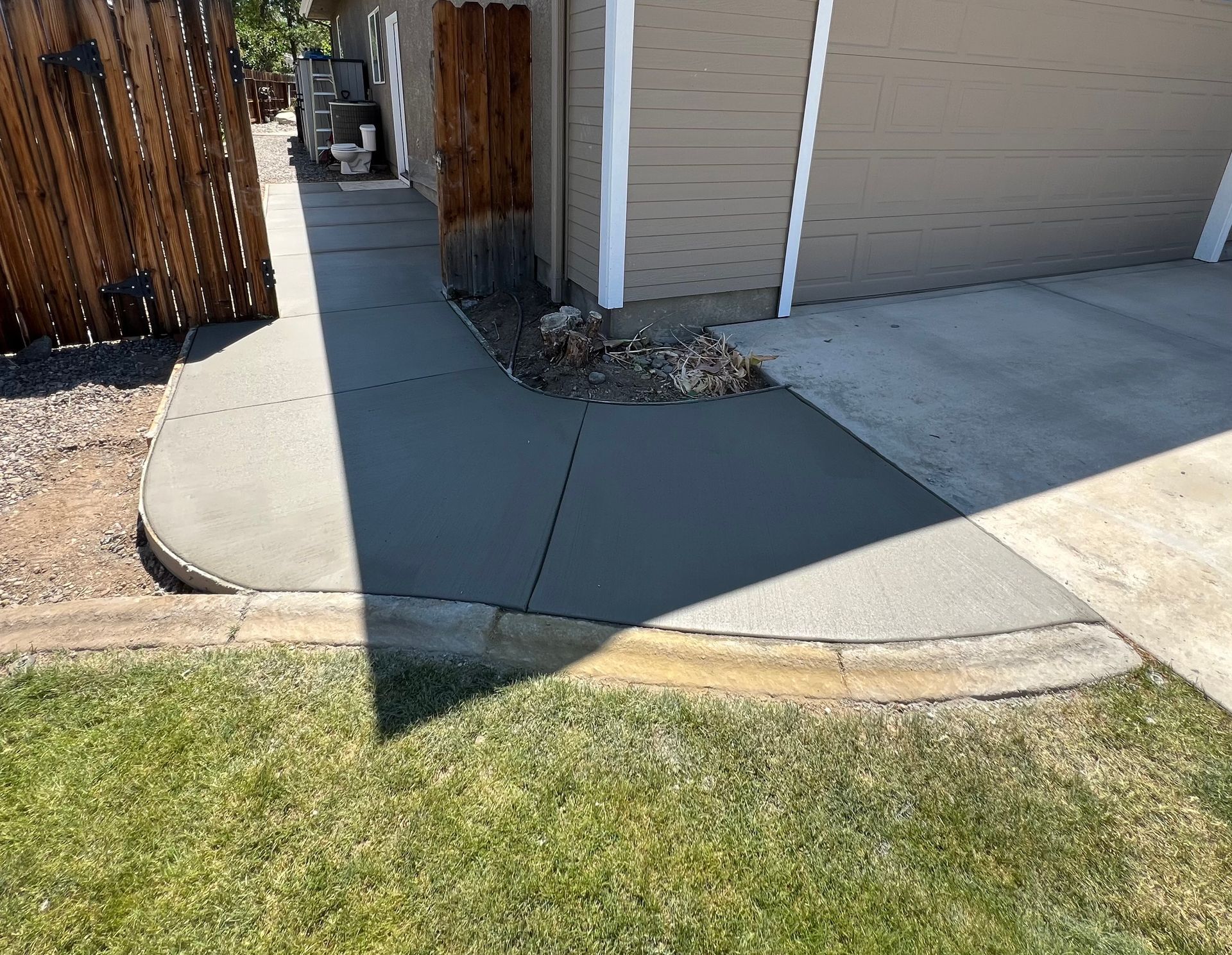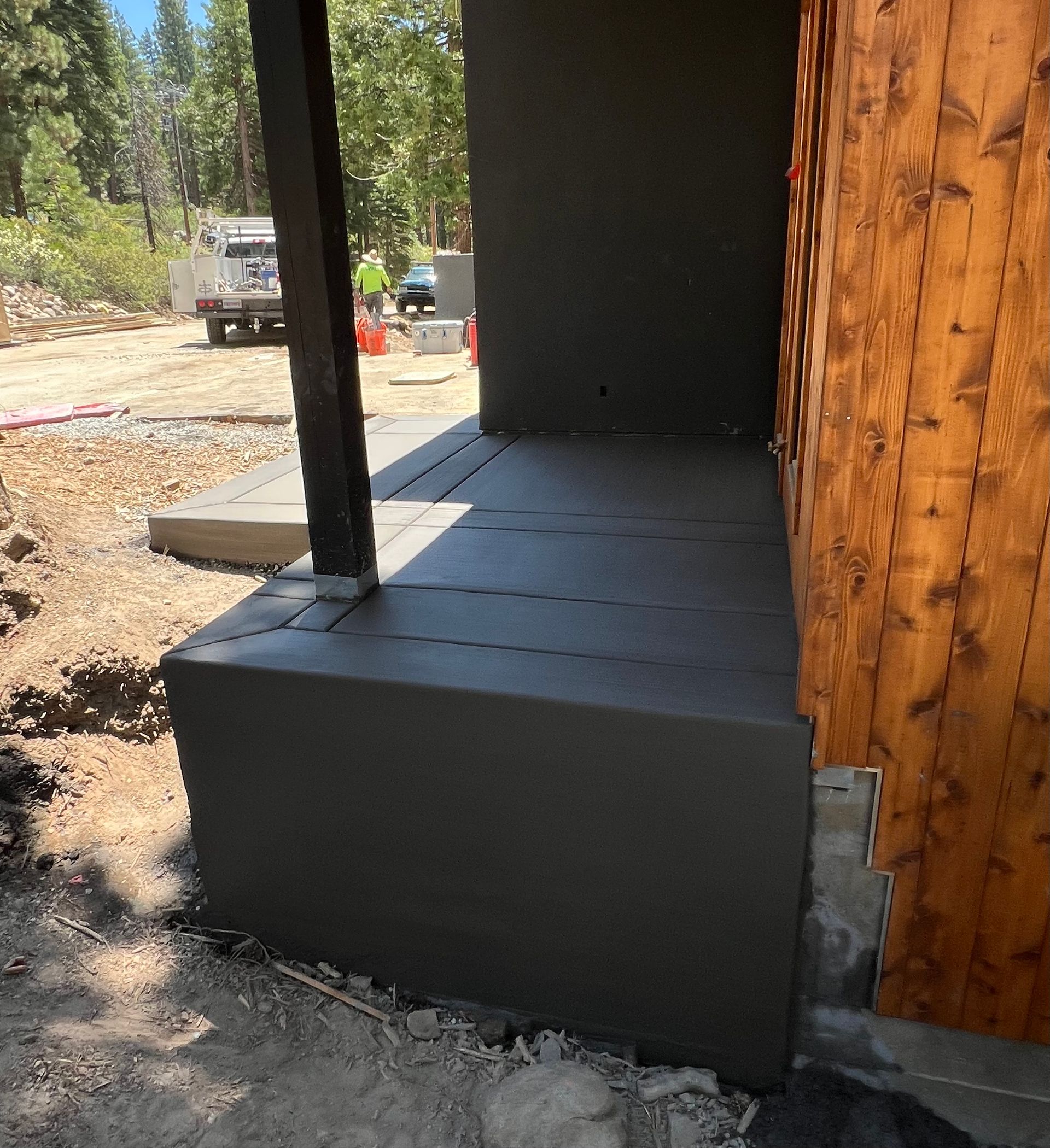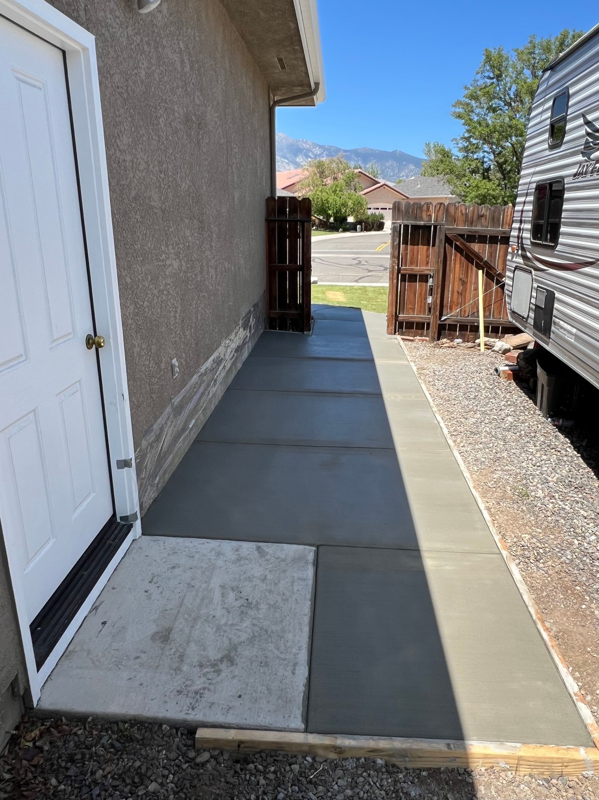 A concrete walkway is being built in front of a house