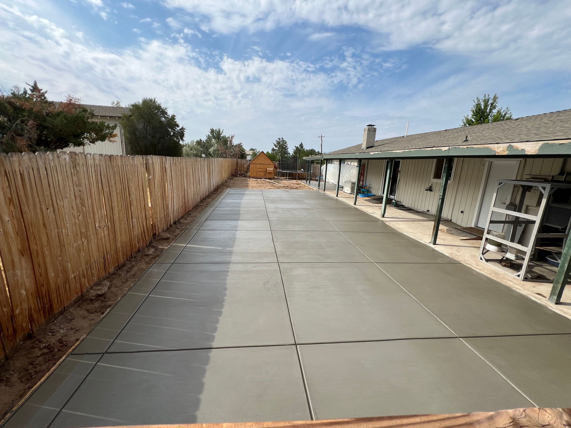 A patio with a wooden fence and a shed in the backyard of a house.