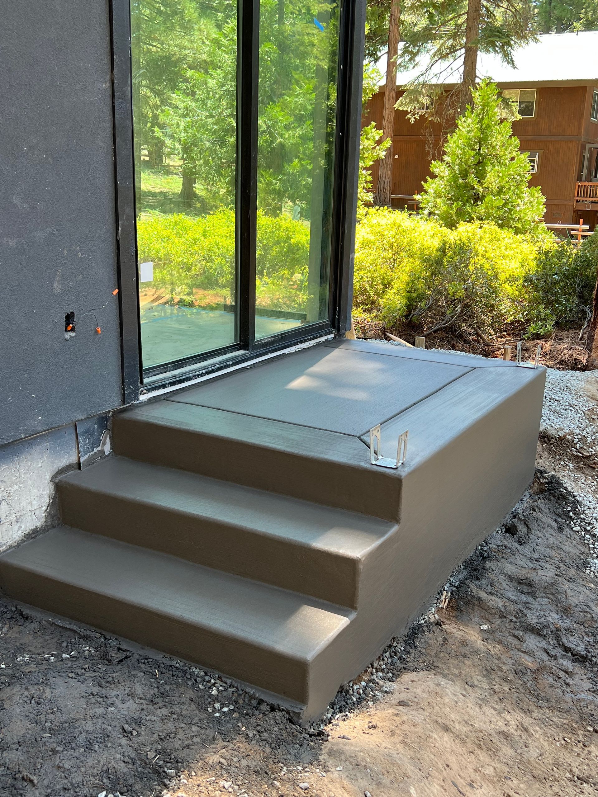 A concrete wall with stairs in front of a house under construction
