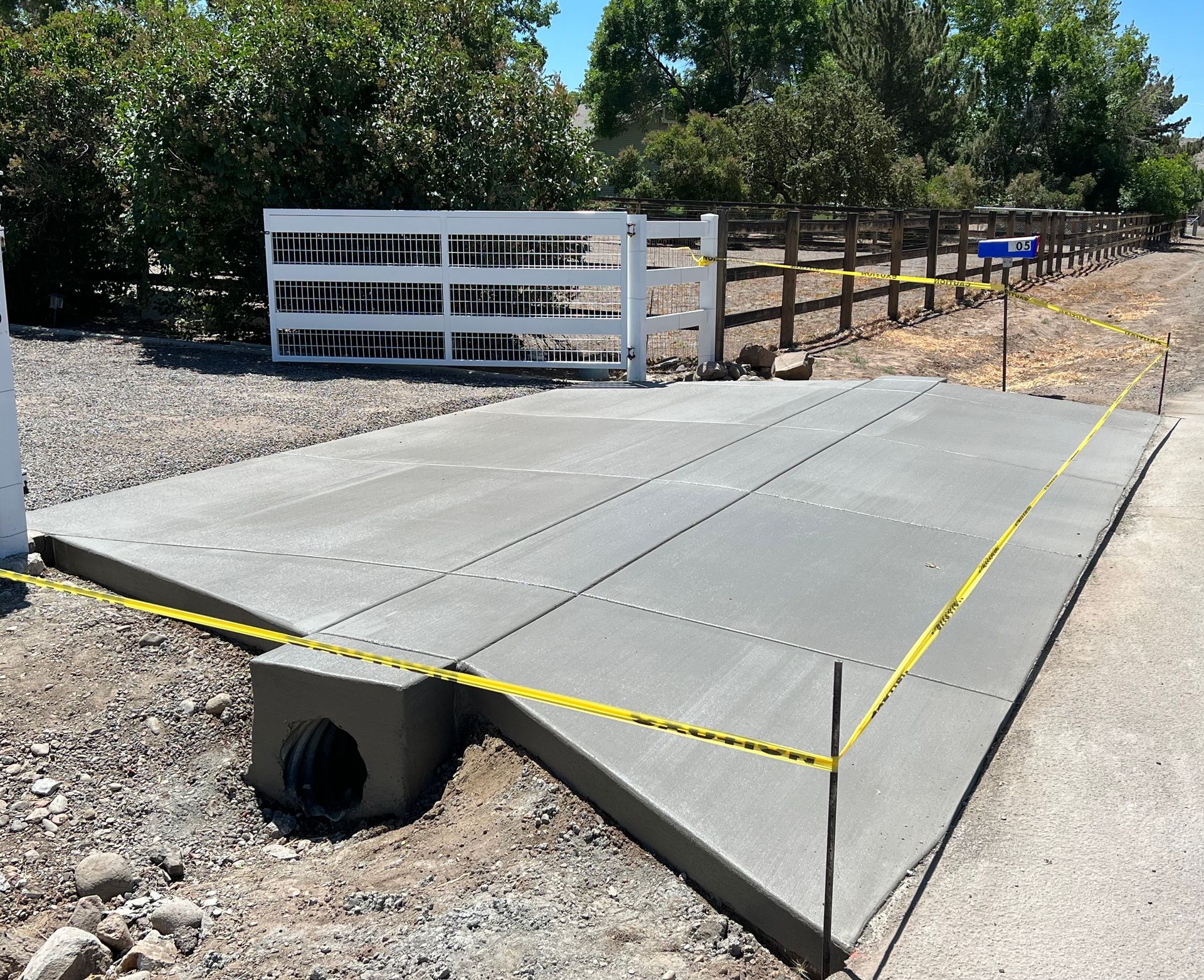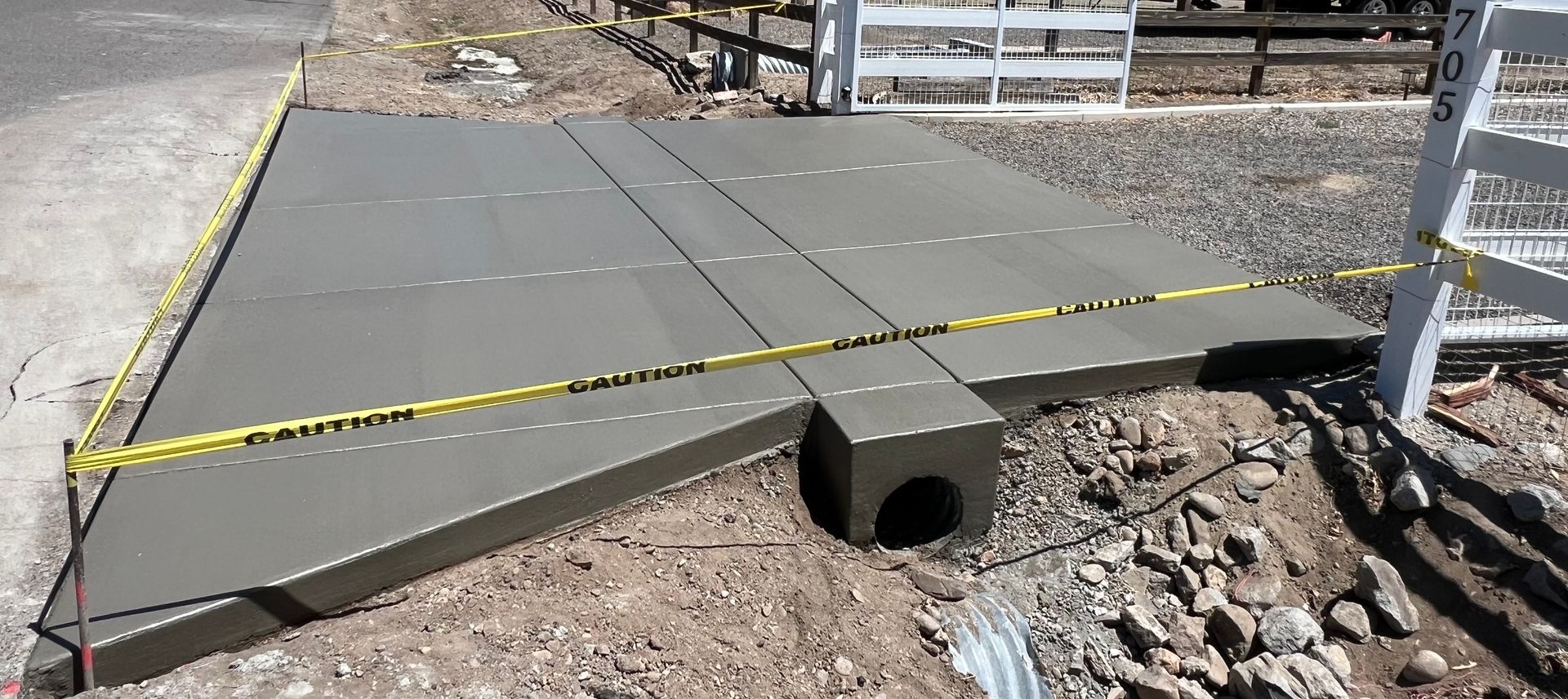 A concrete wall is sitting on the side of a gravel road