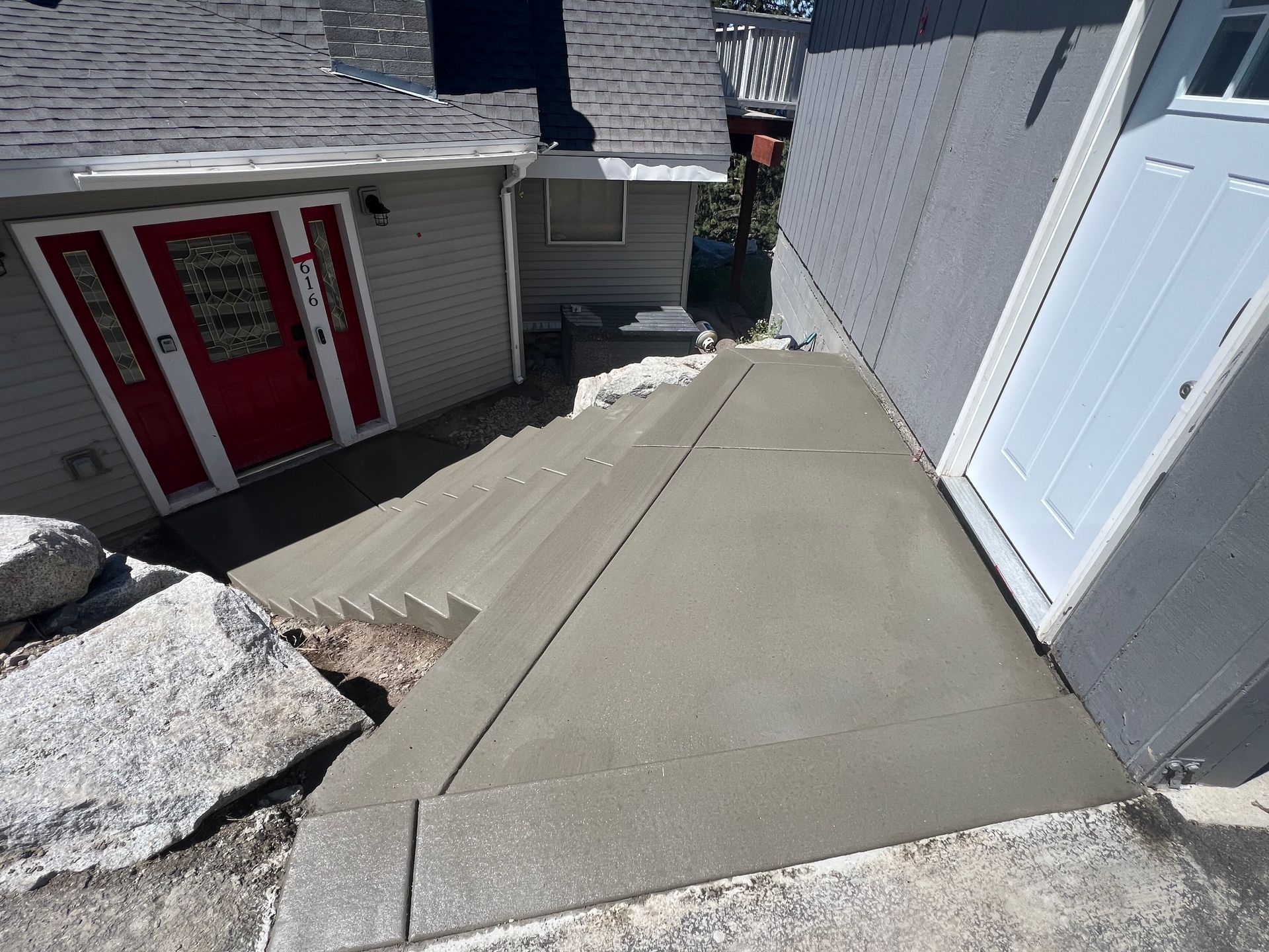 A set of concrete stairs leading up to a house.