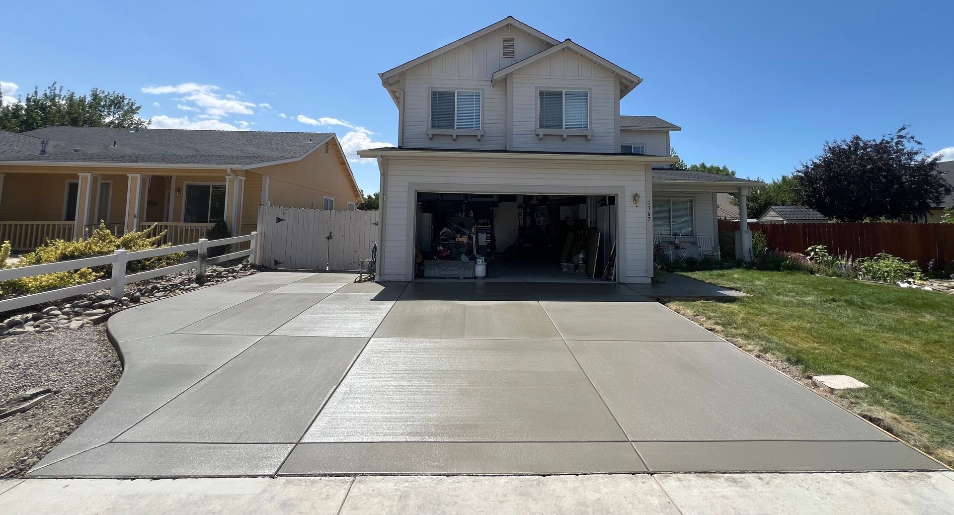 A white house with a concrete patio in front of it.